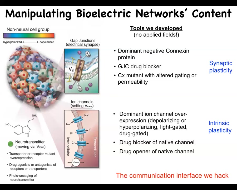 We don't use electromagnetics. There are no magnets. There are no waves, no frequencies. What we are doing is controlling the interface that the cells are using to control each other. They have a bunch of ion channels that set the voltage. They have these electrical synapses. By appropriating tools from neuroscience, we can control both of those things. We can control the network topology and we can control the states of the electric patterns. We use things like optogenetics and drug blockers and activators. This is the communication interface that we're hacking.