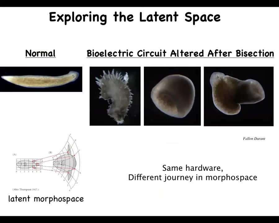 You can see the first example of it when you take an early embryo and you cut it in half. If I cut it into pieces, I don't get half embryos. What I get are normal monozygotic twins, triplets. When you're navigating this anatomical space, in order to get to your goal, you can get to it from your normal state, but the system can also get there from some other starting states, avoiding some local maximum along the way. You're starting to see that it's able to adapt to novel circumstances and, having been moved in the space, it can still find its way to where it needs to go.