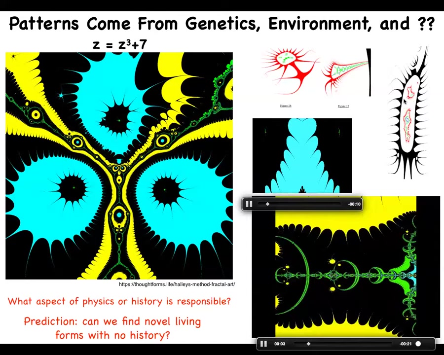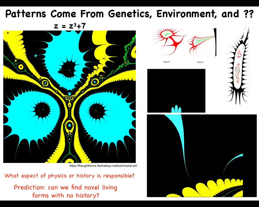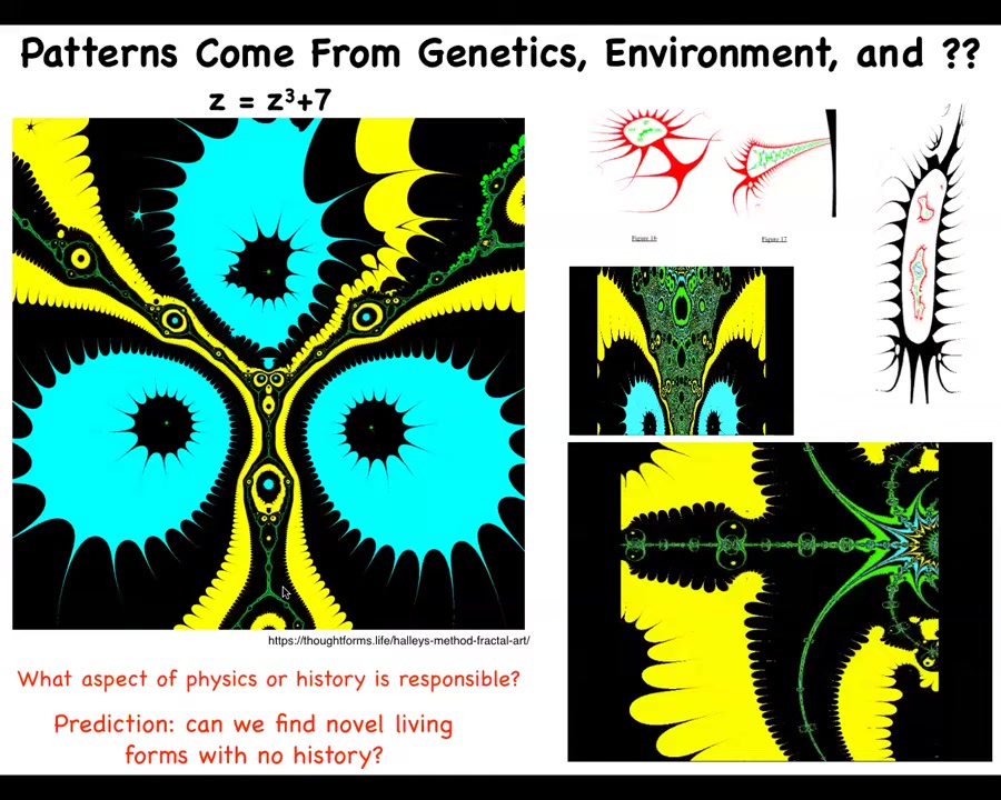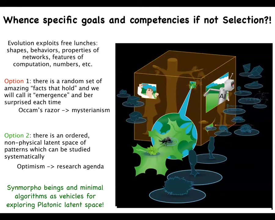 So what I'm arguing for is this idea that there is a massive latent space of patterns that evolution exploits that ingress into the physical world and guide events that are an extra influence besides genetics and environment. And what we're doing is using these synthetic morphologies, antibots and anthrobots and various other things, as exploration vehicles to let us study the patterns in the space. And I don't think these are just the facts that hold about the world. I think this is a systematically organized space that we can study.