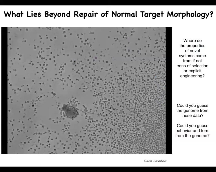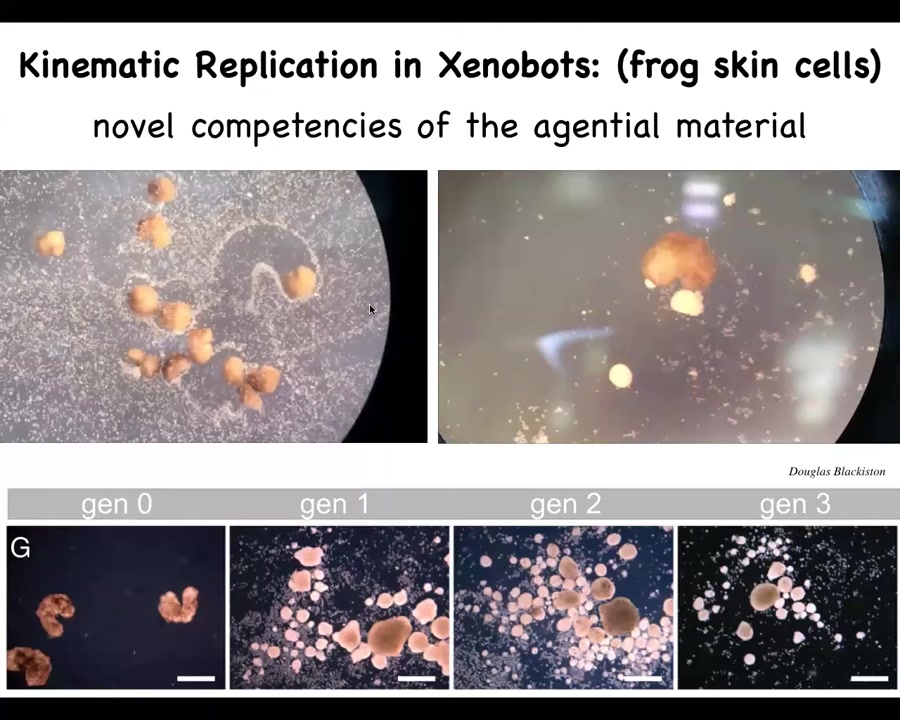 This is a similar kind of model system. These are called Xenobots. They're made from frog skin cells. They self-organize into these little swimming creatures, but they can do something wild. They can do kinematic self-replication, like von Neumann's dream of a robot that would find materials and build copies of itself. If you sprinkle it with loose skin cells, they will build the next generation of Xenobots. When they mature, they do the same thing. They build the next and the next generation.
