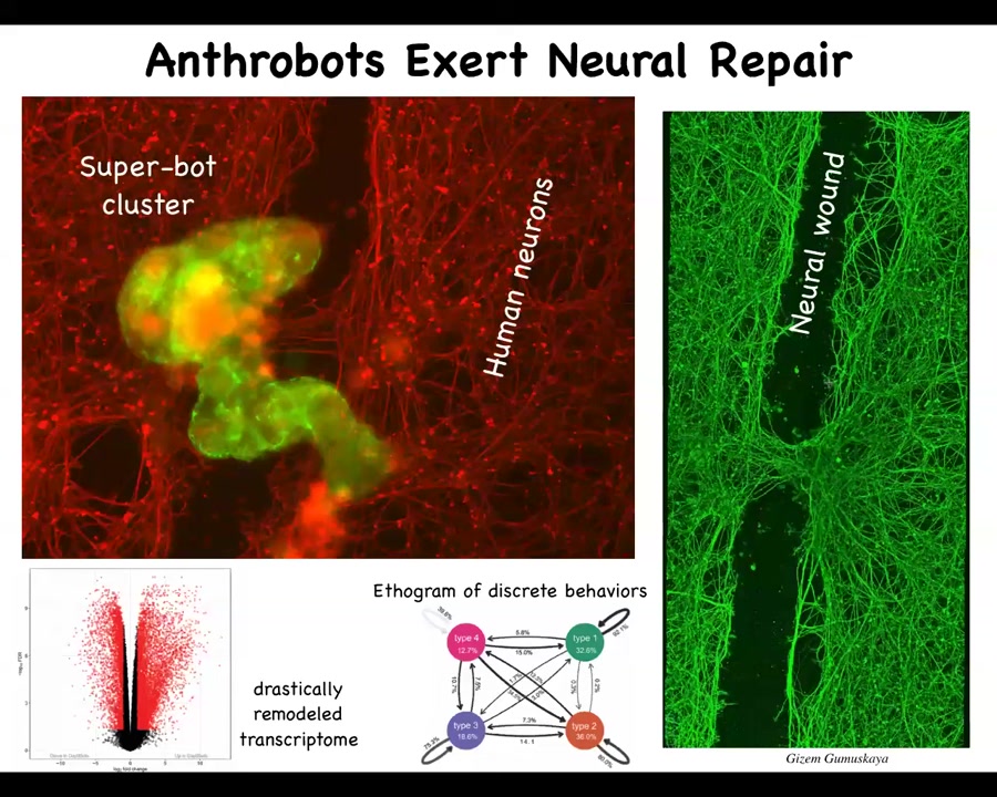 It has some amazing properties. Half of its genome is expressed differently. Given its new lifestyle, it expresses a very different set of genes. It has behaviors that we can build epigrams around as we do for animals. It has this weird ability to heal neural wounds. If you plop them down on it, these things are human neurons. We put a big scratch through it. These anthrobots come down and they sit there and eventually they'll start to heal this gap.