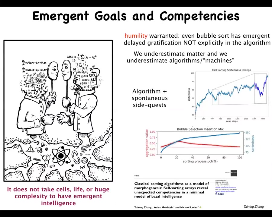I've talked about all the remarkable features of the living material, but there's nothing magic about the proteinaceous hardware that arrived by trial and error of evolution. In fact, extremely simple systems, in this case, we studied sorting algorithms, bubble sort and selection sort, also have what I call side quests. They do things that are literally not in the algorithm. Here's the paper you can take a look at. If you look at their behavior, they have delayed gratification and interesting clustering properties while following the thing that you think they're doing, which is sorting numbers. It's not just humans, it's not just brains, it's not just living material that can do things that are not explicitly encoded in their biochemistry or, in this case, in the algorithm. It goes all the way to the bottom.