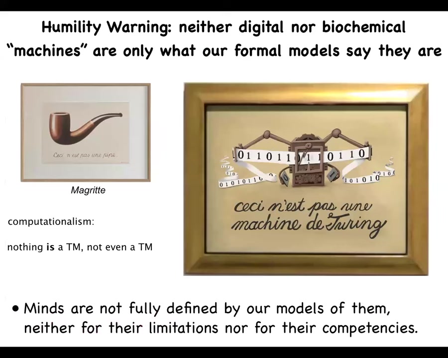 I like this painting by Magritte that reminds us that our models of things are not the things themselves. This says in French, "this is not a pipe." It isn't; it's a painting of a pipe. This is not a Turing machine. It's our model of Turing computation. I think that Minds are not fully defined by our models of them, neither their competencies nor their limitations, any more than human cognition is fully described by the laws of biochemistry.