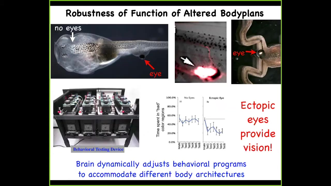 We created so-called Picasso tadpoles. Everything is in the wrong place. The eyes are on the back of the head, the jaws are off to the side, nostrils, everything's in the wrong place. Remarkably, what we found is that these animals still make largely perfectly normal frogs, because all of these different components of the face will move, and they will continue to move in unnatural, novel paths until you get to the right position, and that's when everything stops. In fact, sometimes they overshoot and they have to come back.
