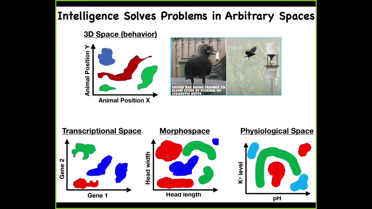 And so one way to think about intelligence is as problem solving, as one navigates a particular space. And there's the familiar three-dimensional space where animals do interesting things, and we all recognize this as behavior and intelligence and so on. But living things navigate all kinds of other spaces. And so the cells and tissues navigate transcriptional spaces. They navigate morphospace, or the space of possible anatomical configurations. And this is what we'll spend all of today talking about. They navigate physiological space. I've only shown two axes. But some of these things are very high-dimensional. For example, transcriptional space is a hugely high-dimensional space. So we're interested in this very general property of being an agent that can navigate these spaces with various degrees of expertise to get from wherever they are to a more desirable, more adaptive region of that space and stay there.