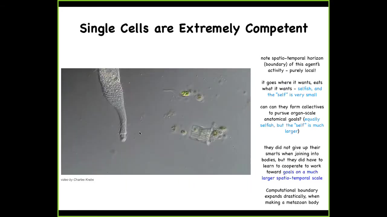 And we start with the fact that single cells are actually extremely competent in their own size and scale. So this is a creature known as a Lacrymaria. It's a single cell. There is no brain. There's no nervous system. There are no stem cells. There's no cell-to-cell communication. This is real time. This creature is handling all of its local goals—physiological, behavioral, anatomical, metabolic—all of these things are being handled at the scale of a single cell and at the expense of the environment. Here it is eating various other life forms in its environment. This is incredible real-time control. Engineers salivate at the sight of this thing. We don't have anything that can do this kind of fine control. But what's interesting is that when individual cells join together, they don't lose all this intelligence and competency. They scale it up.