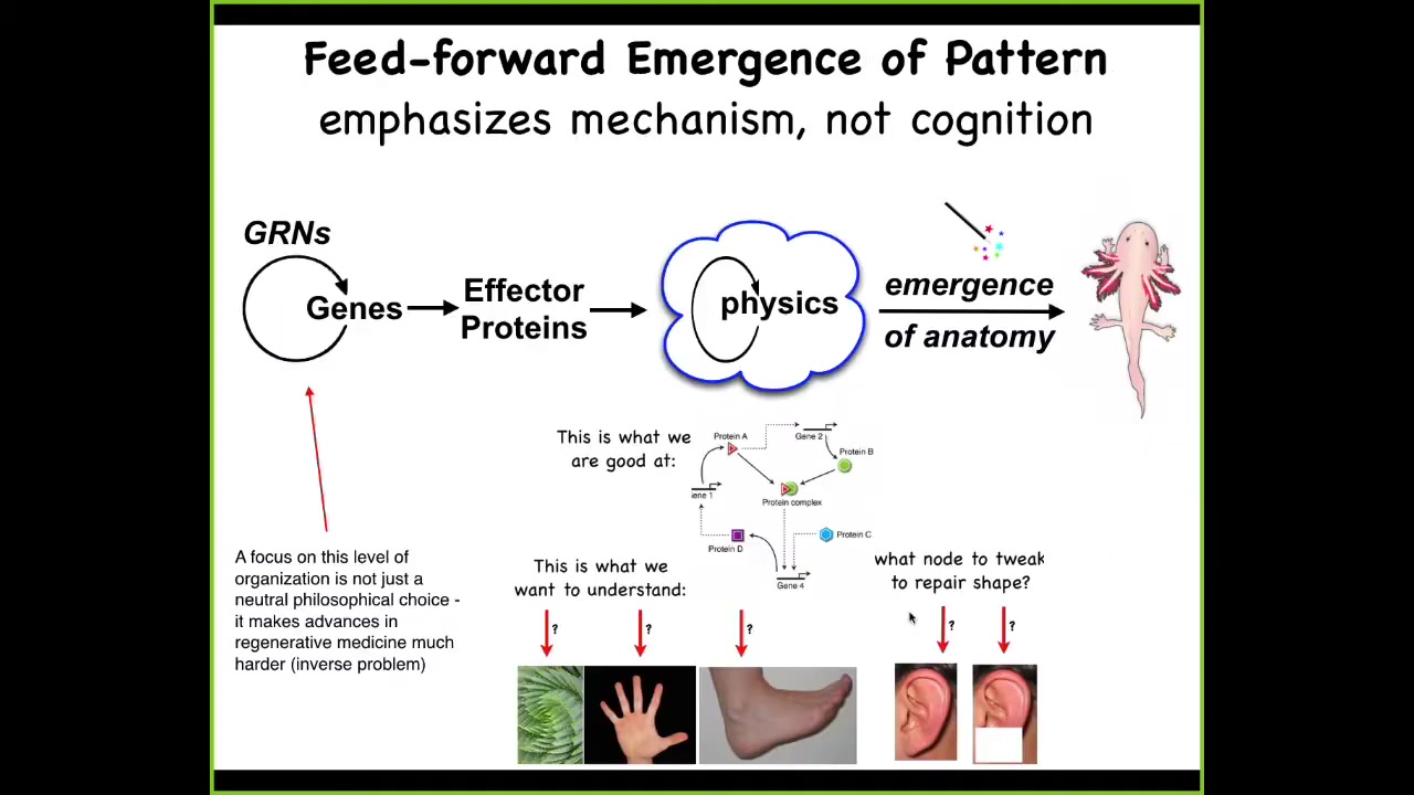 So, in developmental biology... we are taught this very basic system, which is a kind of feedforward scheme, where there are gene regulatory networks. The genes interact with each other, meaning they turn each other on and off. Some of these genes encode effector proteins that are sticky or they exert force or they diffuse. There is this massively parallel physics where everything interacts according to local rules of chemistry. Voila, there's this process of emergence and something like a salamander comes out the other end.