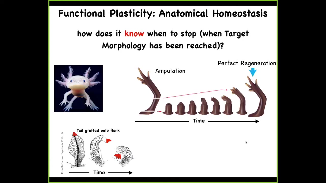 You can see here, again, another example of plasticity in this, of problem solving in this space. If you were to amputate the limb here, it starts to grow, and then you get a perfect limb, and then it stops. If you amputate up here at the shoulder, it starts to grow from here on, and still gets you exactly the right limb, and then it stops. If you graft the tail onto the flank of the salamander, it will slowly remodel in place and become a limb. The cells at the tip of the tail will become fingers. There's this incredible robustness and ability to get to where you're going despite these unexpected perturbations.