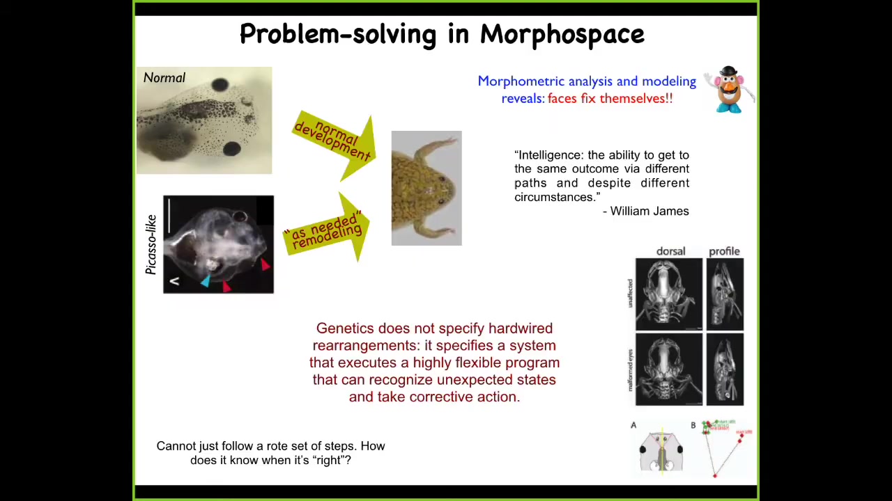 This meets a definition of intelligence put out by William James, which is the ability to get to the same outcome via different paths and despite varying circumstances. What we found is that the genetics doesn't specify hardwired rearrangements. What it does specify is an incredible machine that is an error minimization engine. What it's able to do is to continue to remodel until the error is within tolerances, which raises an obvious question: how does it know when it's correct?