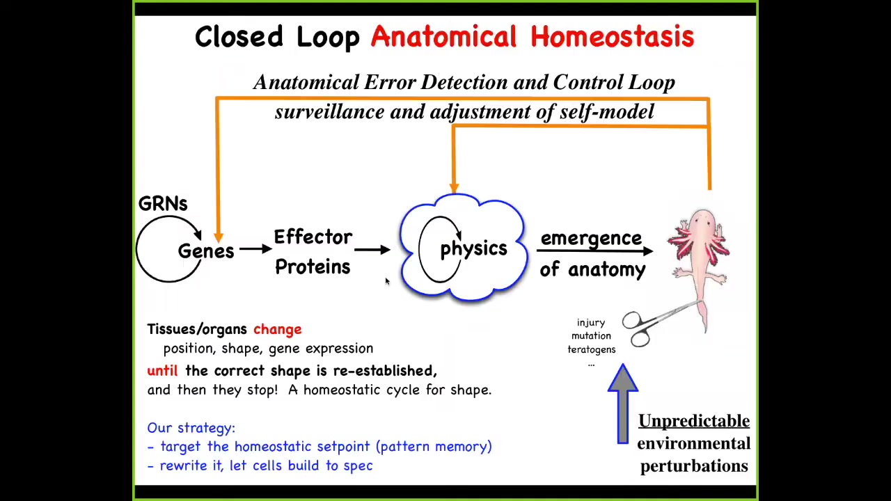 So what we then do in my lab is, to this feedforward scheme, we add feedback loops, both at the level of physics and genetics, that will act to get you back to the correct, not only physiological, but morphological level when the body has been deviated. This might be injury, teratogens, or pathogens.
