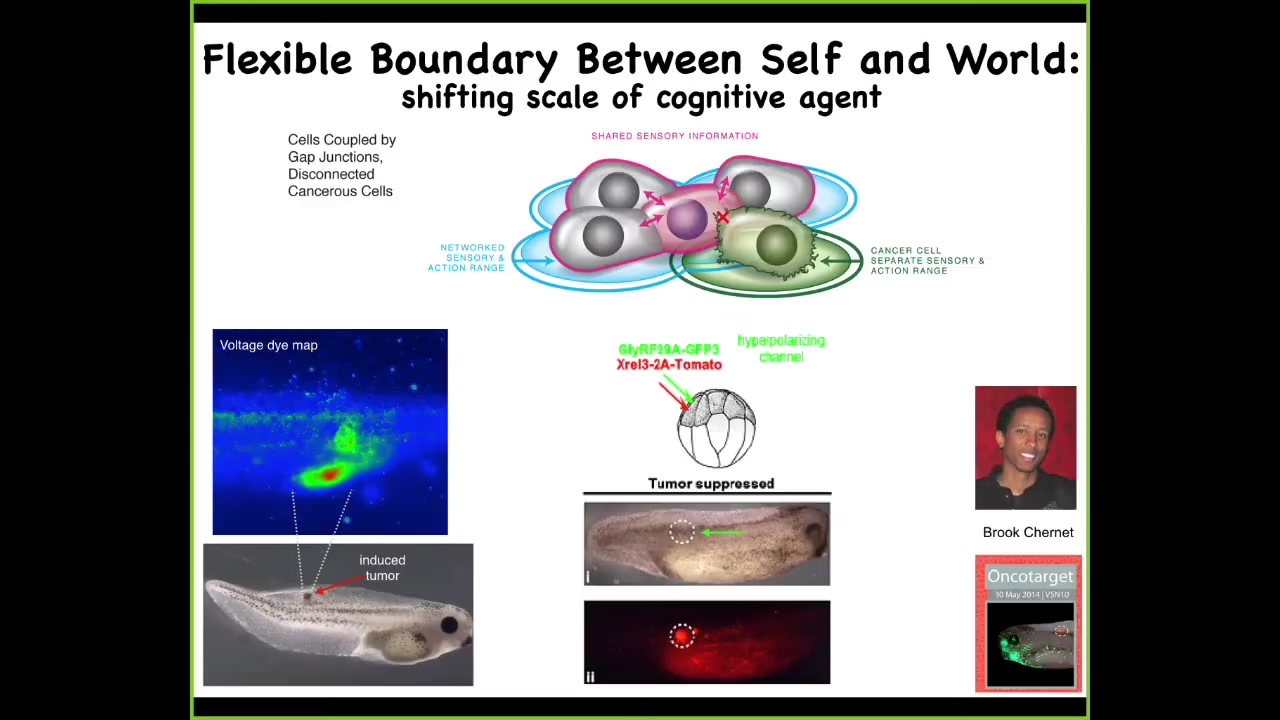 So one thing you can do is you can ask, here we have the problem of cancer. We introduce a human oncogene, and at some amount of time, these cells are going to make a tumor, and then they're going to start to metastasize. What you have in that situation is a breakdown of a reduction of the size of the goals of those cells. In other words, they used to be part of a collective that were working on building a piece of muscle or some skin or, in fact, the whole tail. When they convert to tumorigenesis they shrink that computational boundary. They revert back to a unicellular lifestyle where these cells' goals were tiny. Their goals were: each cell tries to become two cells, and they go wherever life is good and wherever they can get the most nutrients. The rest of the animal to them at this point is external environment.