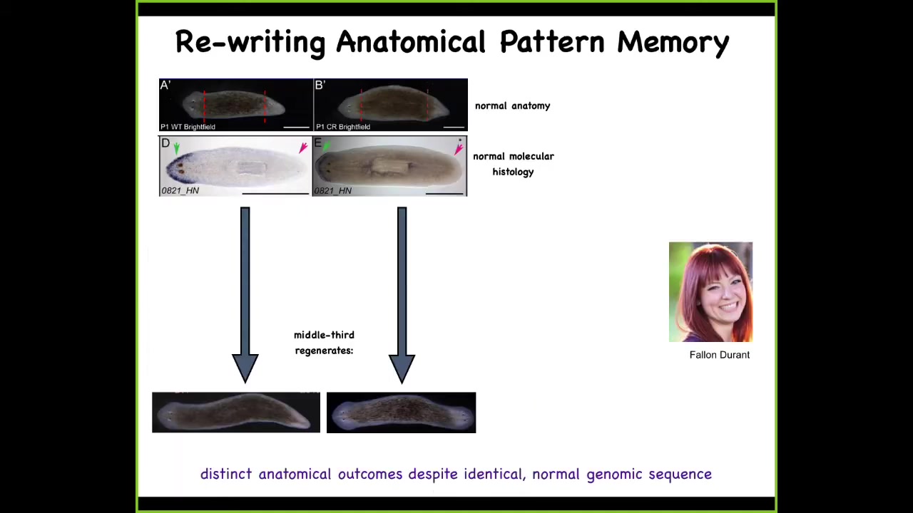 When we injure that animal, that is when these cells begin to pay attention to this and build the two-headed animal. Up until then, they ignore it completely, and that means that a single-headed normal planarian anatomy can store at least one of two possible versions of what it will do in the future if it gets injured.