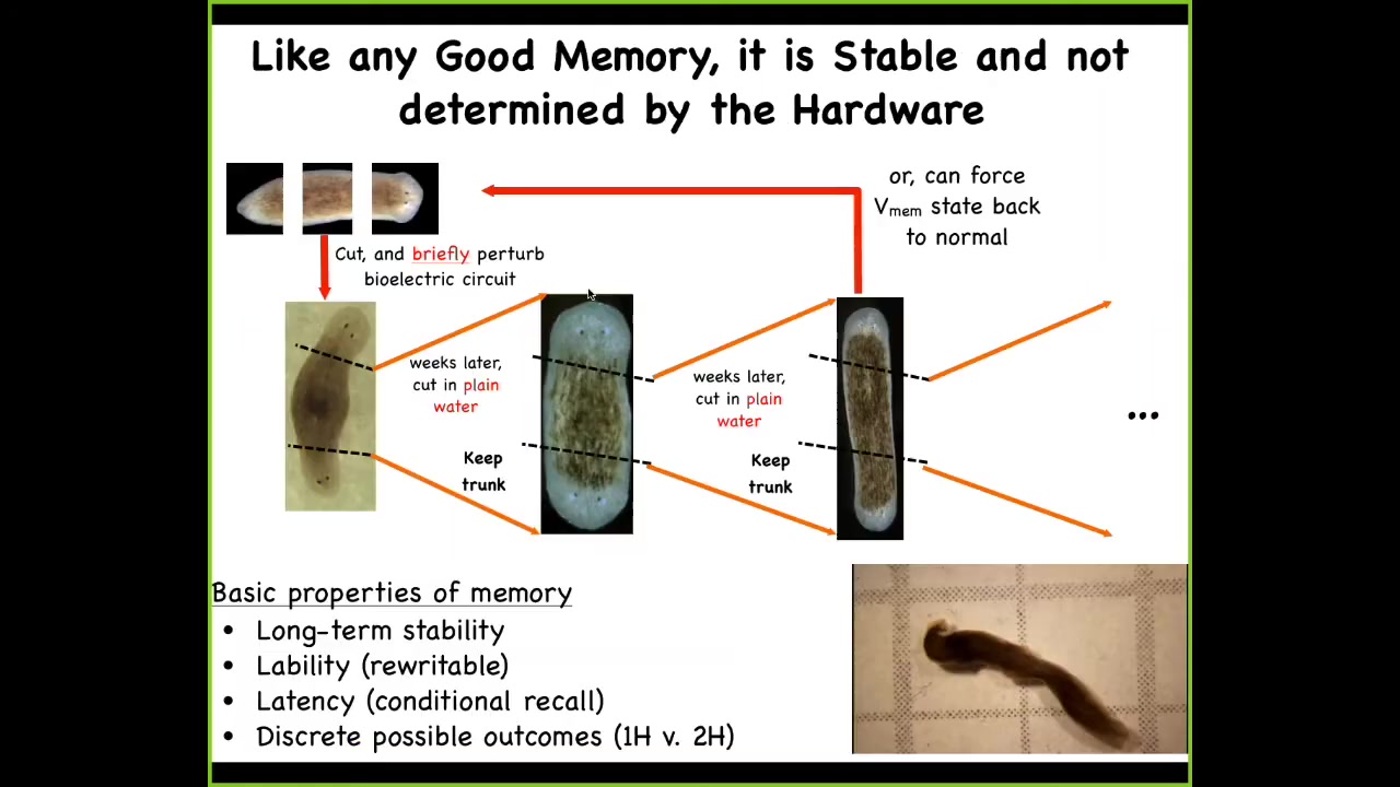 That target morphology, that pattern to which the animal regenerates, the set point, the set point of that anatomical homeostasis, is stored in a stable electrical circuit that can diverge from the anatomy; they're completely separate. Being able to store different types of information in exactly the same hardware. Maybe this is the sort of basement of counterfactual memories. This animal is storing a representation of what it will do in the future if it gets injured, not anything related to what the situation is right now. Again, this map of a one-headed animal. Now, why do I keep calling it a memory?