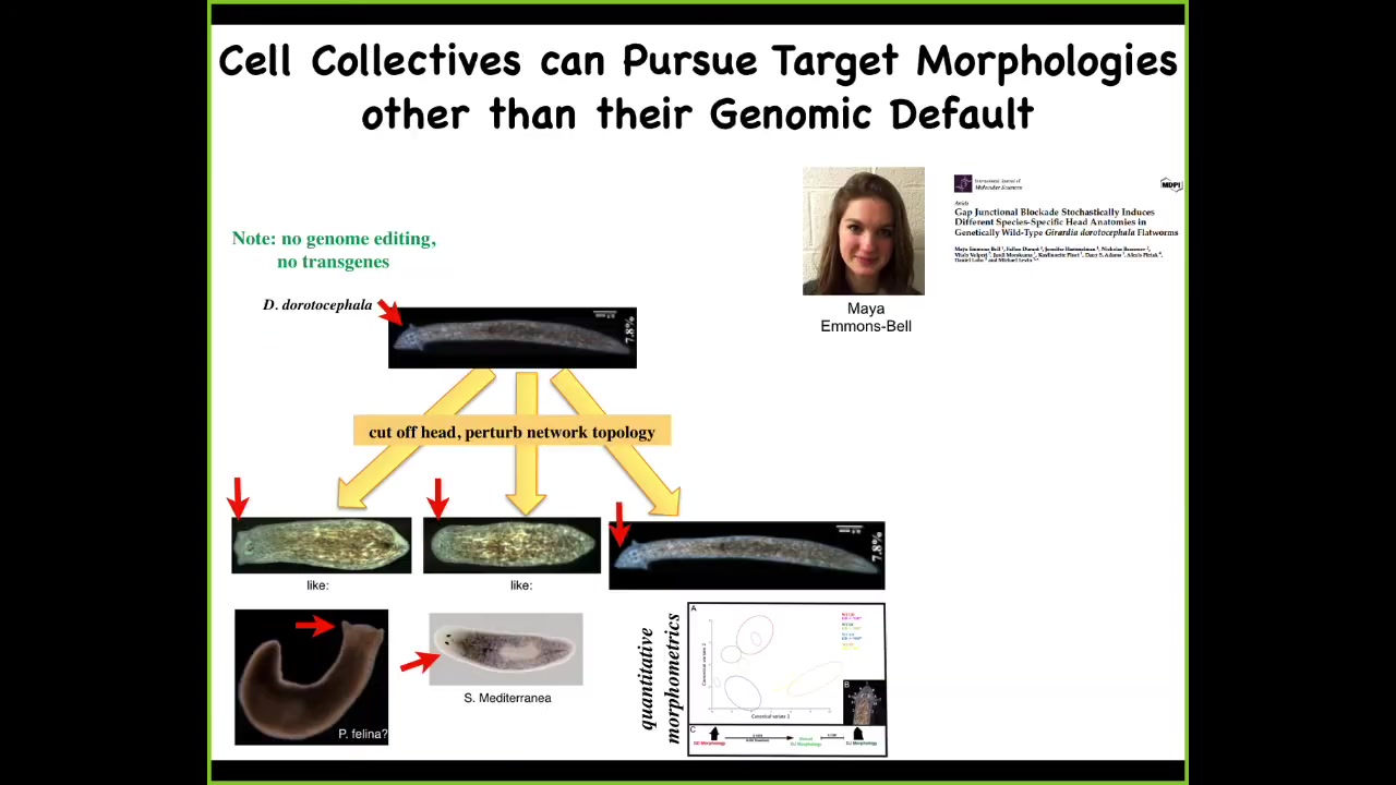 And that becomes a very powerful notion because you can take, and this is the work of an undergraduate, Maya Emmons-Bell, who showed that you can take genetically wild-type planarian with a triangular head, amputate the head, perturb the gap junctions for a couple of days to prevent the cells from properly settling into their correct state. And from this, you can regenerate your normal triangular head, but you can also get round heads like an S. mediterranea, or you can get flat heads like a P. felina. You can make heads appropriate to other species of planaria without any genomic change. Not only the shape of the head, but the shape of the brain, the distribution of the stem cells, becomes exactly like these other species. So you can knock this thing into other regions of morphospace that have attractors that are normally occupied by other species. Evolution can use this process in the short term, and then long term there's probably some sort of canalization, like a Baldwin effect, which is how you get these genetic lines. But you can do more than that.