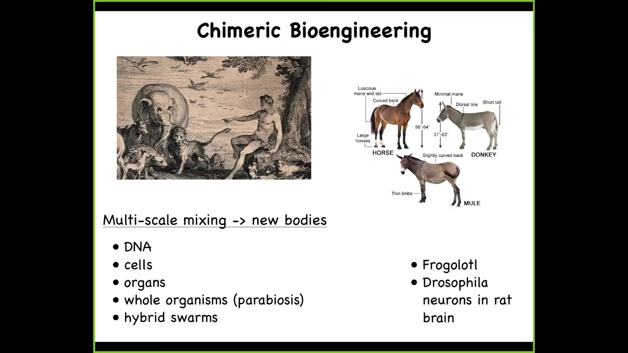 This is a painting of Adam naming the animals in the Garden of Eden, a fixed set of animals, and that's all that there are, and here they are. We now can create incredibly rich chimeras. We can mix DNA. We can transplant cells and organs. We can do parabiosis of whole bodies. We can make hybrid swarms. We can make things like a frogolotl, which we're working on in our lab, which is a mixture of a frog and an axolotl. Baby axolotls have legs. Frog embryos do not have legs. You have access to the frog genome. You have access to the axolotl genome. Can you tell me if the frogolotl is going to have legs? Nobody knows. What we're missing still is this general ability to guess the goal states of collective agents, especially when these collective agents consist of multiple different subunits. People have been doing something like this for many years. Somebody discovered that if you made a horse and a donkey, you'd get this mule. In general, we can now do these incredible things.