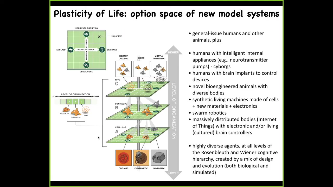 So in the future, what I think is that what Darwin referred to as "endless forms most beautiful" are basically just a tiny corner of this incredibly huge option space where synthetic bioengineers are going to be creating novel life forms that are every kind of combination of evolved material, meaning cellular types of material, designed hardware, and software agents in all sorts of combinations. We already have some cyborgs, humans with various implants. And we have hybrots, robots with living brains and living cells on them. And every combination of this is going to be somewhere, which raises all kinds of interesting possibilities. But certainly we will be able to study novel nervous systems, novel creatures without nervous systems. What kind of behaviors do they have? Where are they on this cognitive continuum?