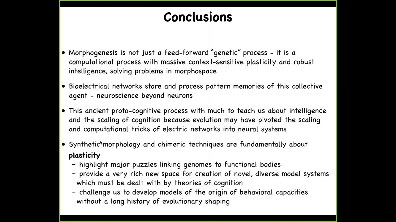 What I've tried to argue is that morphogenesis is not simply an emergent process. It is a computational type of process with massive context-sensitive plasticity and a kind of intelligence that solves problems in morphospace. I could have told the exact same story about physiological space and transcriptional space. Electrical networks store and process pattern memories. This is a kind of neuroscience that doesn't involve neurons in the sense that almost every concept that we've seen in neuroscience can be ported to these kinds of non-neural events. This ancient process has much to teach us about intelligence and the scaling of cognition.