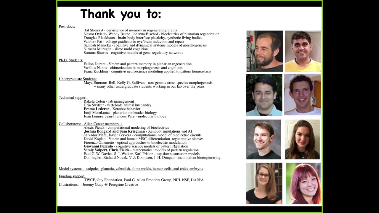 The fact that you can even make these chimeras that are connected to a computer and they're driving all sorts of novel bodies and interacting with metamaterials and all of these things is fundamentally about the plasticity of life. It highlights major puzzles, the open questions that link genomes to functional bodies. It provides a very rich new space for creating new model systems, which have to be dealt with by theories of cognition. The challenge is to develop models of the origin of behavioral capacities that don't have a long history of evolutionary selection. Here are a few papers that you might be interested in if you want to follow up on some of the details.