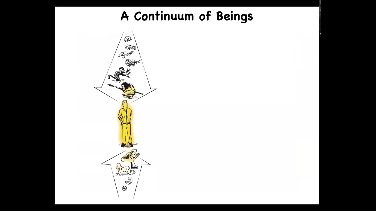 But if we take developmental biology and evolution seriously, we realize that both on long phylogenetic time scales as well as developmental time scales, we all share a continuity of much different kinds of beings. This is really a slow continuum. Any special properties that we have, you have to ask, where did these properties come from, and to what extent did they exist in our various ancestors and when did they begin or end, if you think that these are discrete categories.