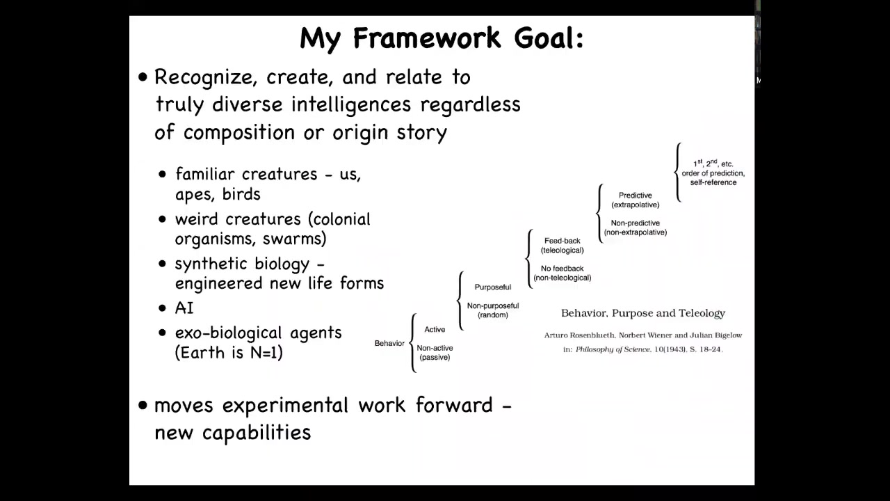 I have this framework that I've been working on. It's called TAME, T-A-M-E, stands for Technological Approach to Mind Everywhere. The idea is simply this. We need to be able to create and relate to truly diverse intelligences, regardless of what they're made of or how they got here. That means that we would like a single framework on which we can compare and understand the kinds of cognitive systems that exist in familiar creatures. We humans, primates, birds, octopus, these kinds of things, but also really unusual creatures, colonial organisms, swarms, in synthetic biology, new engineered life forms, software, artificial intelligences, and maybe someday exobiological agents, realizing that the Earth, all of the examples on Earth are just an N of 1. We really have to understand broader than that.