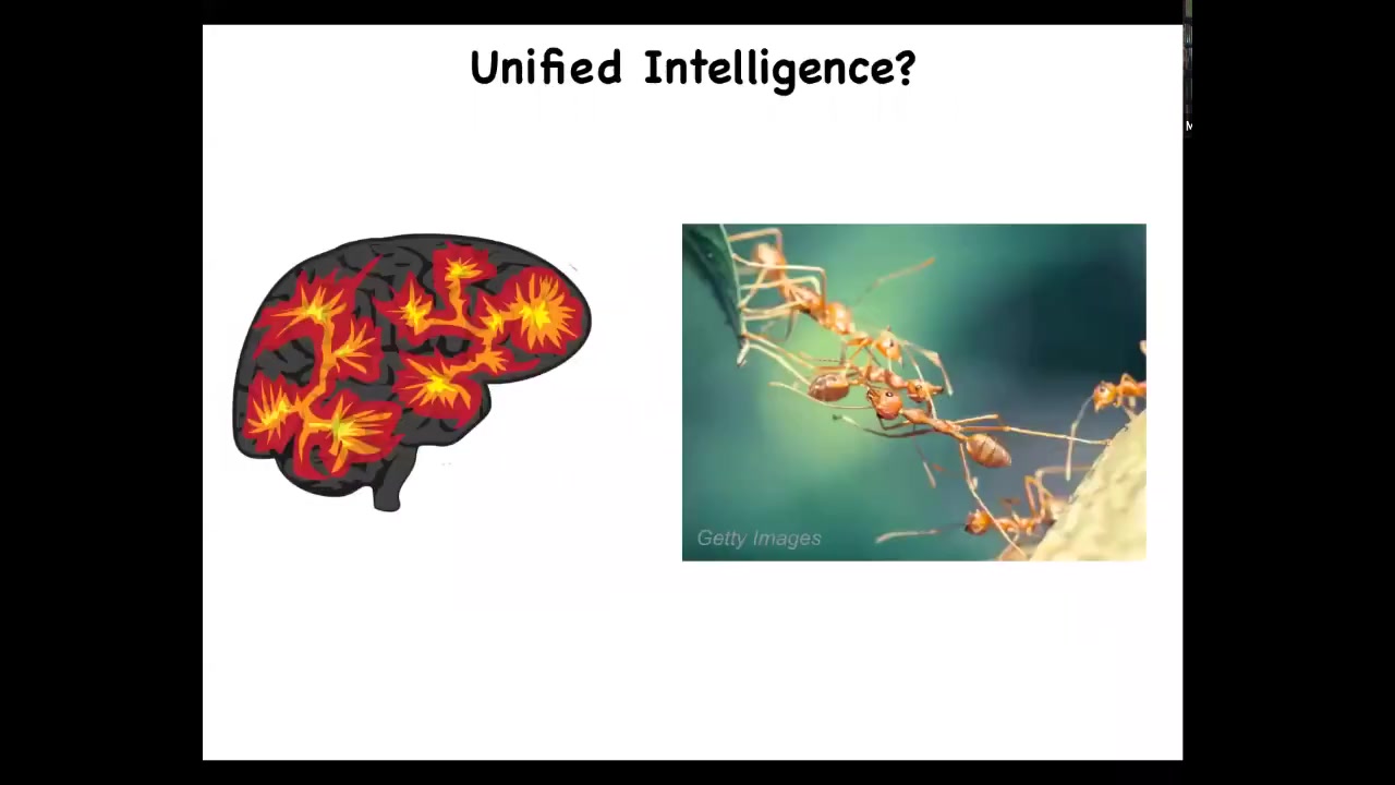 There have been a variety of ways to think about this. In particular, there's this idea of collective intelligence. People sometimes say ants and colonies of bees and birds are perhaps a collective intelligence. But we are a unified intelligence. We're not a swarm of ants. We are a collective intelligence. We have a brain and it's centralized. And Descartes wanted to find a center in the brain that was specifically connected to this unified experience that we had. But we are also made of parts. In fact, all intelligence is collective intelligence.