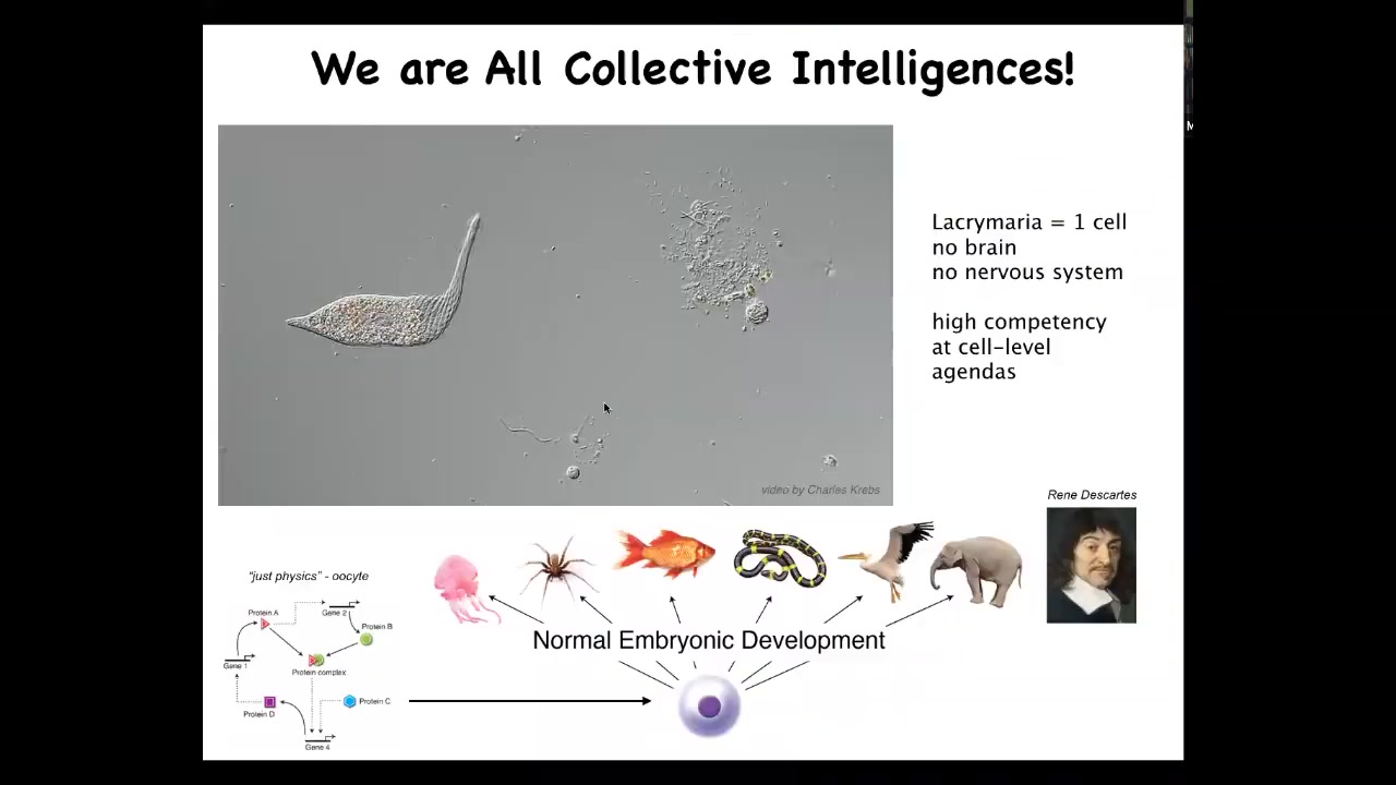So you can see it's handling its physiological, its metabolic, its behavioral goals at the level of a single cell. Look at the ability: it's feeding, it's eating bacteria and other things in its environment. This is the envy of soft robotics and other kinds of engineering. We have nothing that's of this level of sophistication. So each one of our cells was an independent organism. And this makes it really important to understand how these capacities, these competencies of our subunits add up together to give us what feels like a unified cognitive experience.