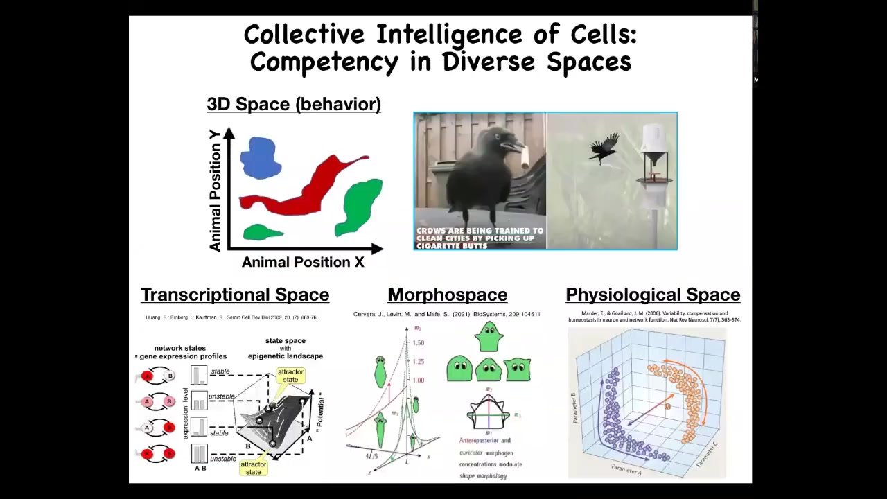 We're pretty used to recognizing intelligent activity in three-dimensional space. Our cognitive and sensory structures are primed to look for medium-sized objects moving at medium speeds through three-dimensional space and doing clever things like this crow that's learned to pick up cigarette butts to receive a reward. But imagine if we had the innate sense of feeling all the parameters of your blood chemistry, for example. If we had an innate feeling of that, much like we see the outside world, we would have no problem recognizing, for example, that our liver, our kidneys, our various organs are performing very interesting intelligent behaviors in adjusting to all these novel circumstances in physiological space.