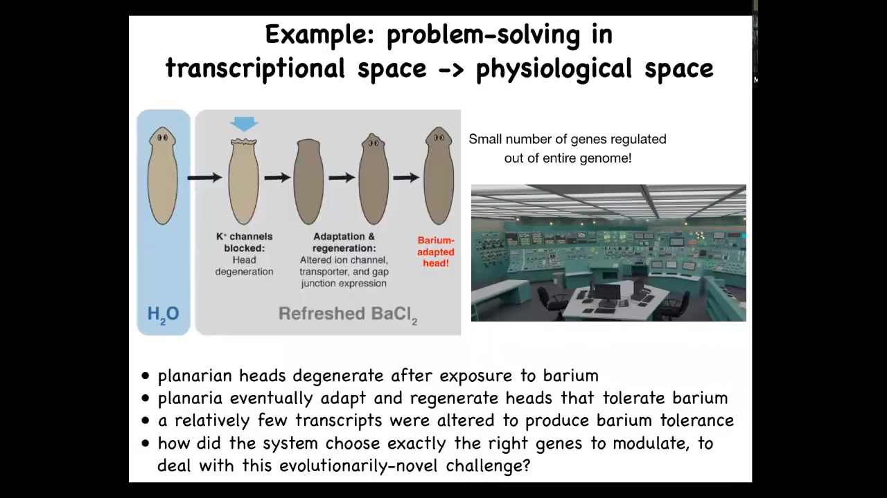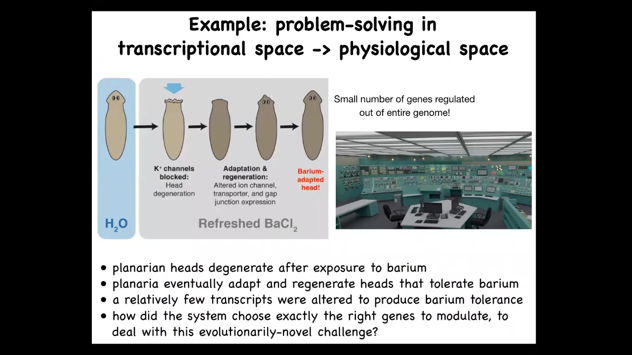 Now here's the amazing thing. Planarians never encounter barium in nature. There has never been evolutionary pressure for being able to deal with barium exposure and for knowing what to do when you're in barium. How did these cells know exactly which genes to turn on to deal with this new physiological stressor? You can imagine this problem. It's because 20,000 genes or however many there are; it's like you're in a nuclear reactor control room, it's melting down, there's a big problem. How do you know what to do? In fact, you can't. There's no time to just start flipping genes randomly on and off. The cells don't turn over like bacteria, so there's no time for some kind of random change where everything dies and the one successful cell repopulates the head. There's this real problem of understanding how these cells navigate to the correct region of transcriptional space. They have to take this walk from this state to this state, and it's not known how they do that. That's an example of problem solving in physiological space.