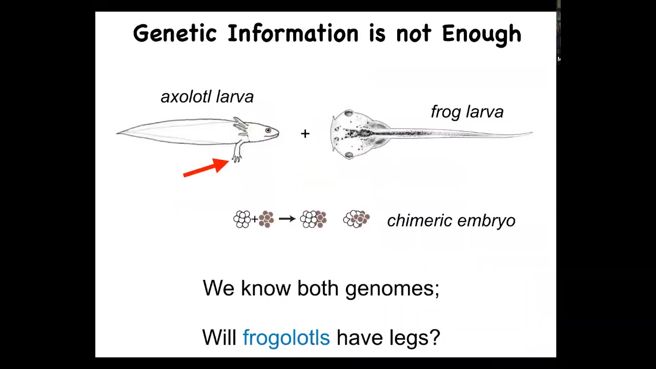 So isn't that enough? What else do we need? Here's a very simple example. This is an axolotl larva. These are salamanders, and baby axolotls have little legs. This is a tadpole of a frog. Frog tadpoles do not have legs. In our lab, we can make a chimeric embryo called a frogolotl by mixing early cells. Will the frogolotl have legs or not? We have both genomes: the axolotl genome and the frog genome. Can you tell me if the frogolotl is going to have legs? The answer is no. We have absolutely no frameworks currently to determine this kind of anatomical information, even though you have the full genetics for both animals.