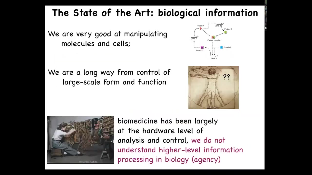 My argument is that in biomedicine we are where computer science was in the 40s and 50s: it was still stuck at the hardware level. Everything is about pathways and molecules and genome editing. This is all at the level of hardware, but we have an opportunity to exploit something remarkable that exists in biology and also in some computer systems, which is higher-level information processing. In biology, we call this agency.