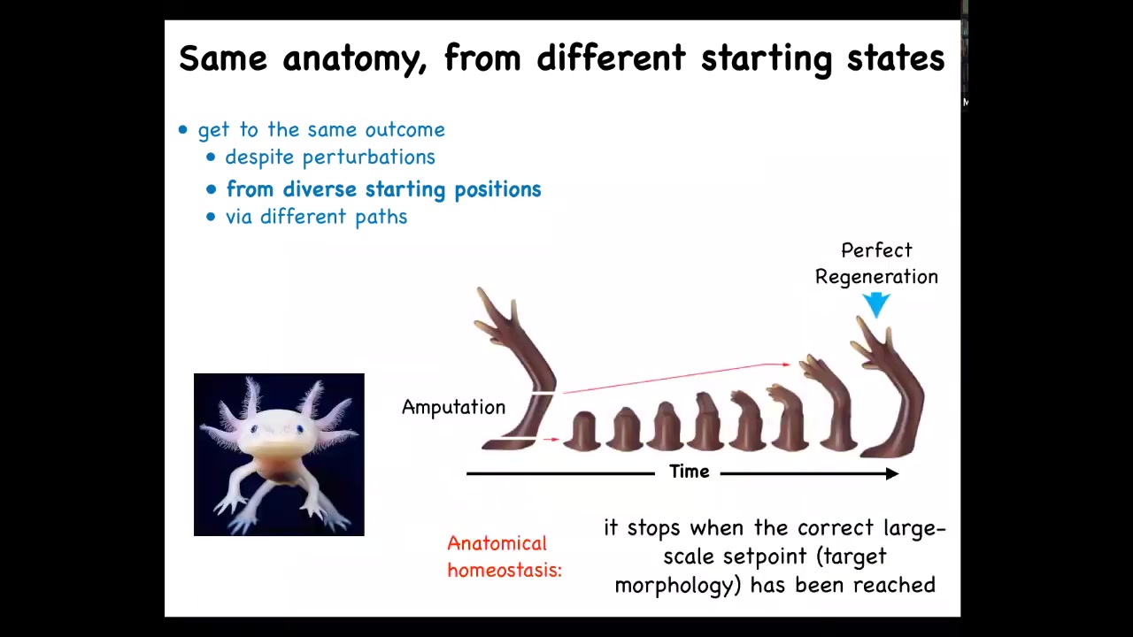 I want to show you some hypotheses about that. In evolution, what we have through multicellularity is an expansion of goal states. This cell is very good at handling very local goals. It's never going to work towards any other sort of large scale goal. But together in a collective, and I've shown you some evidence that what binds that collective together is electrical communication and the properties of electrical networks, they can work on much bigger goals in a different space. Here's the goal of making a limb. And if you've made a limb and I deviate you from that goal, you will use, as the cellular collective, energy and very rapidly try to get back to that state. Individual cells have no idea what a finger is or how many fingers you're supposed to have, but the collective certainly does, and it will keep implementing this under various types of deformations. That is taking a bunch of low-level minds and making something that's able to pursue large-scale goals in a different space, in the anatomical space.