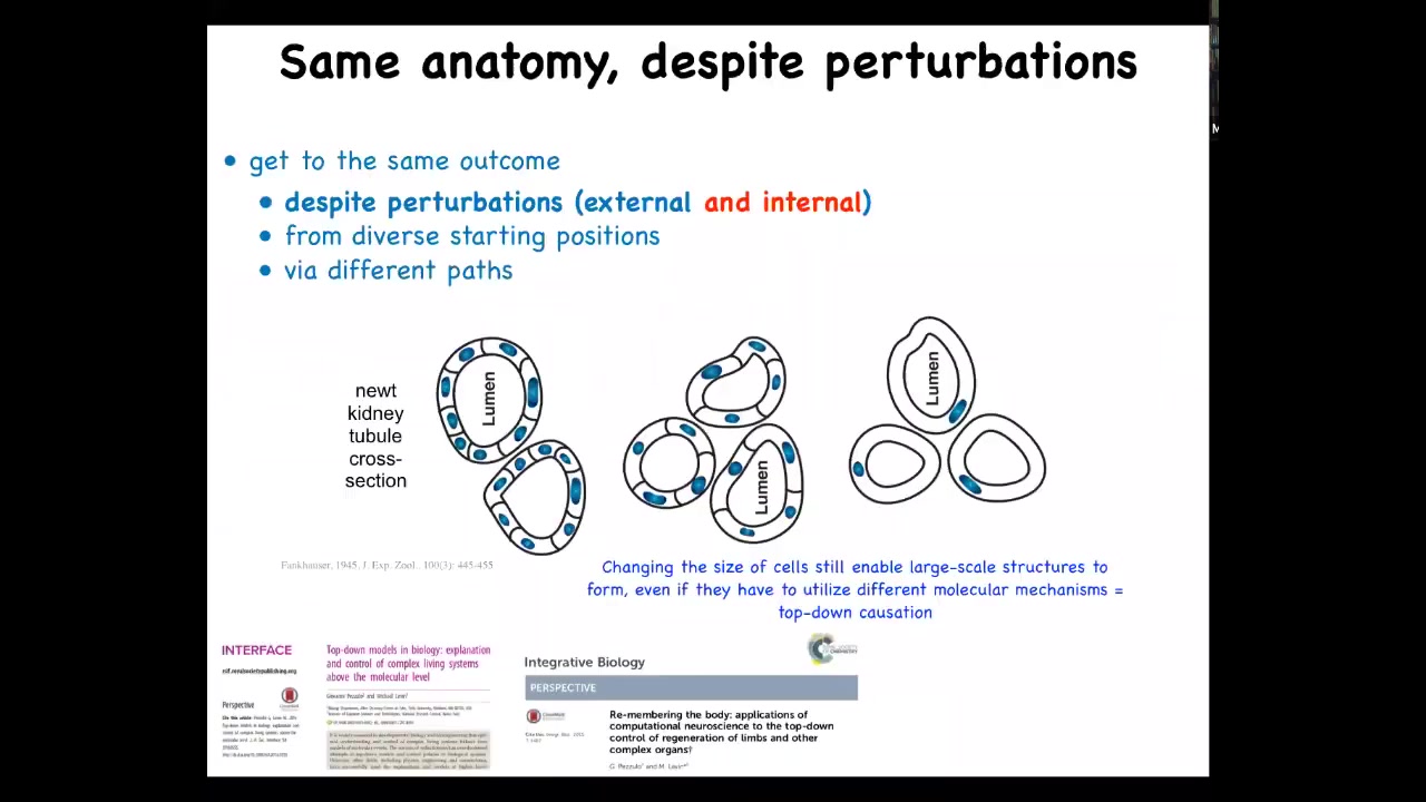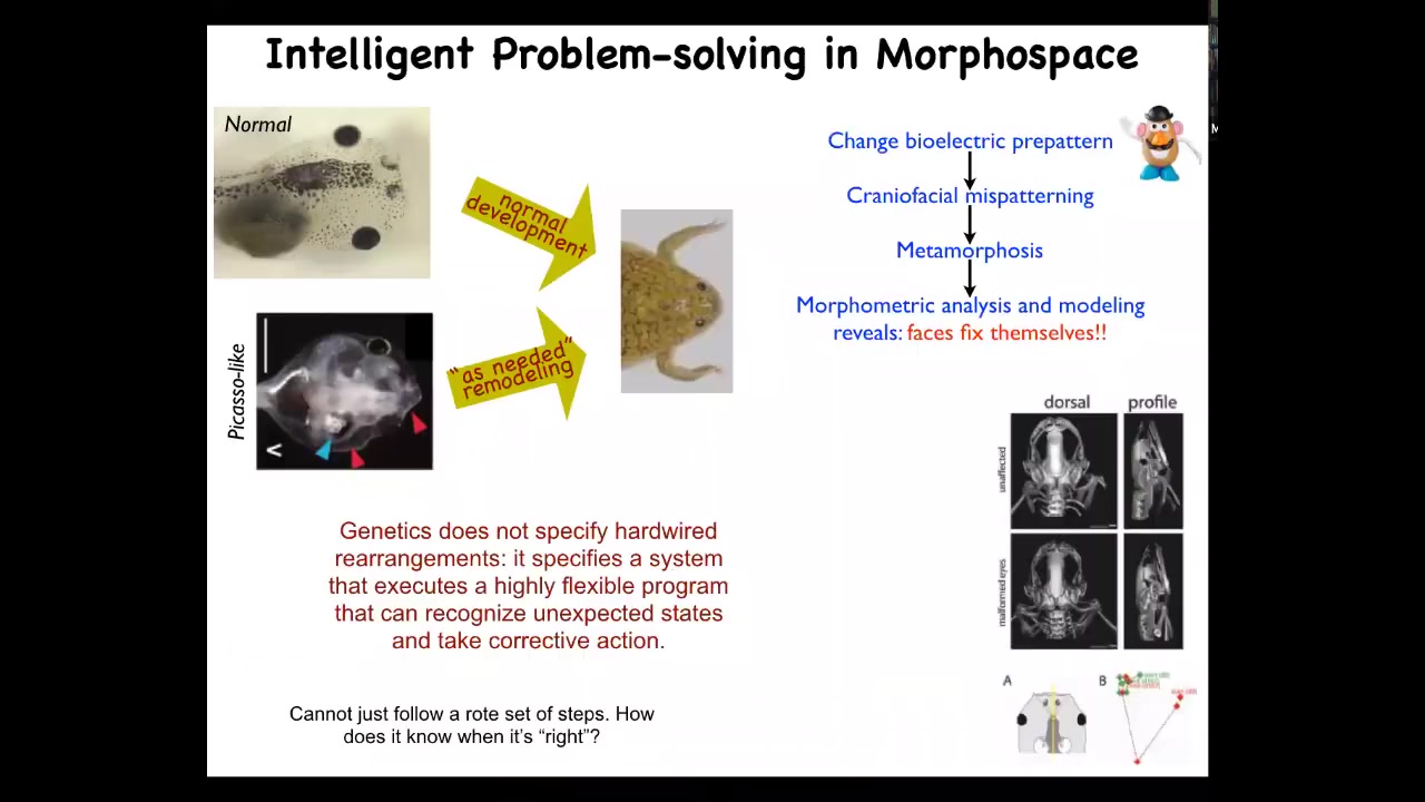We have really interesting implications for evolution here, which are not only due to the multi-scale competency of the organs: you put a bunch of eye cells on the tail, and they can still form an eye, they figure out how to connect, and the whole thing still works. If you have a mouth that's off in the wrong place, it will readjust itself.