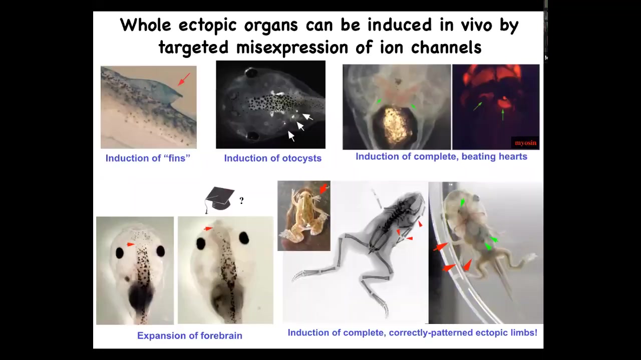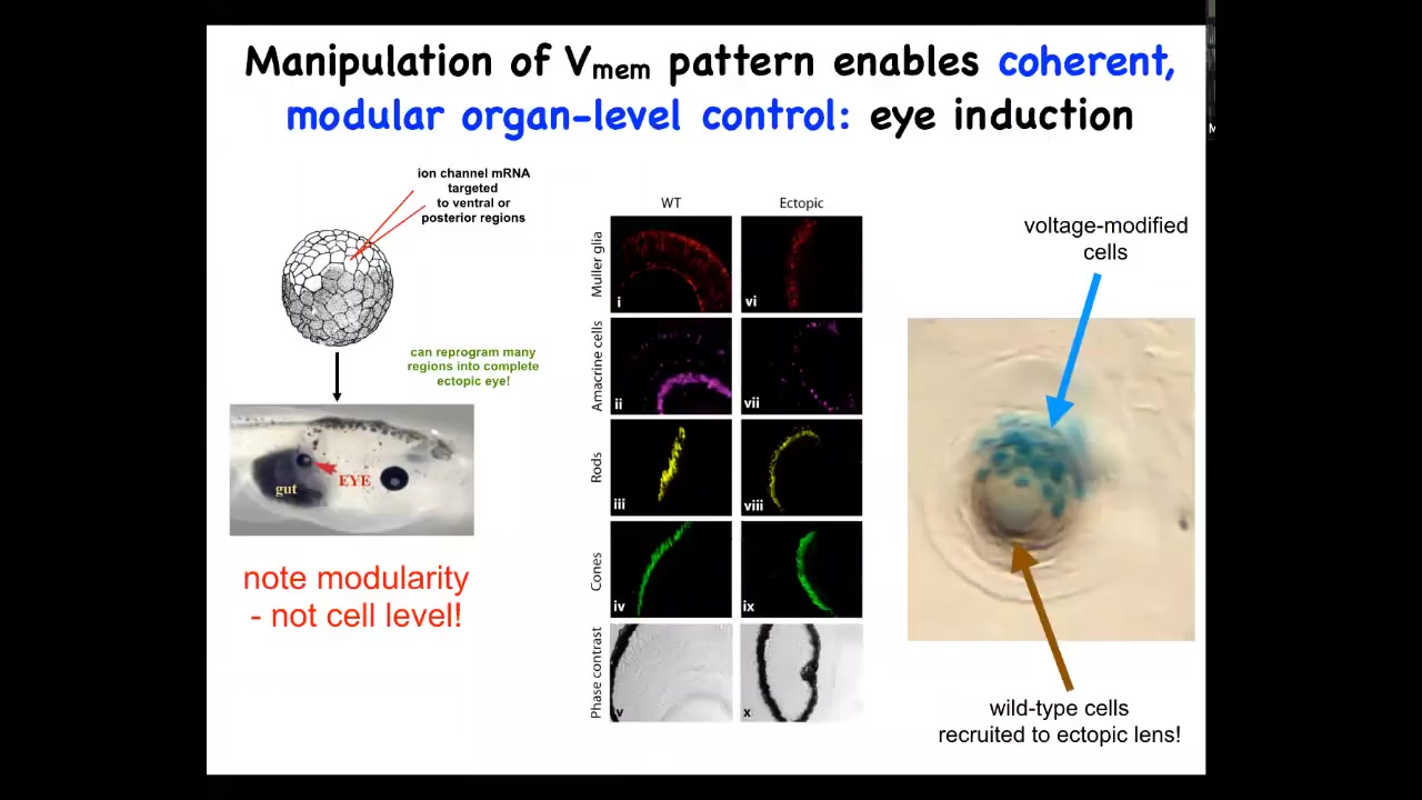 Whole organs can be re-specified. Again, we're programming the collective. We're not telling individual stem cells what tissue to be. We're telling a whole region you should be an eye or a leg or something else. What is an eye or a leg? Individual cells don't have any way of representing that, but collectives do. The way they represent it is through these electrical signals.