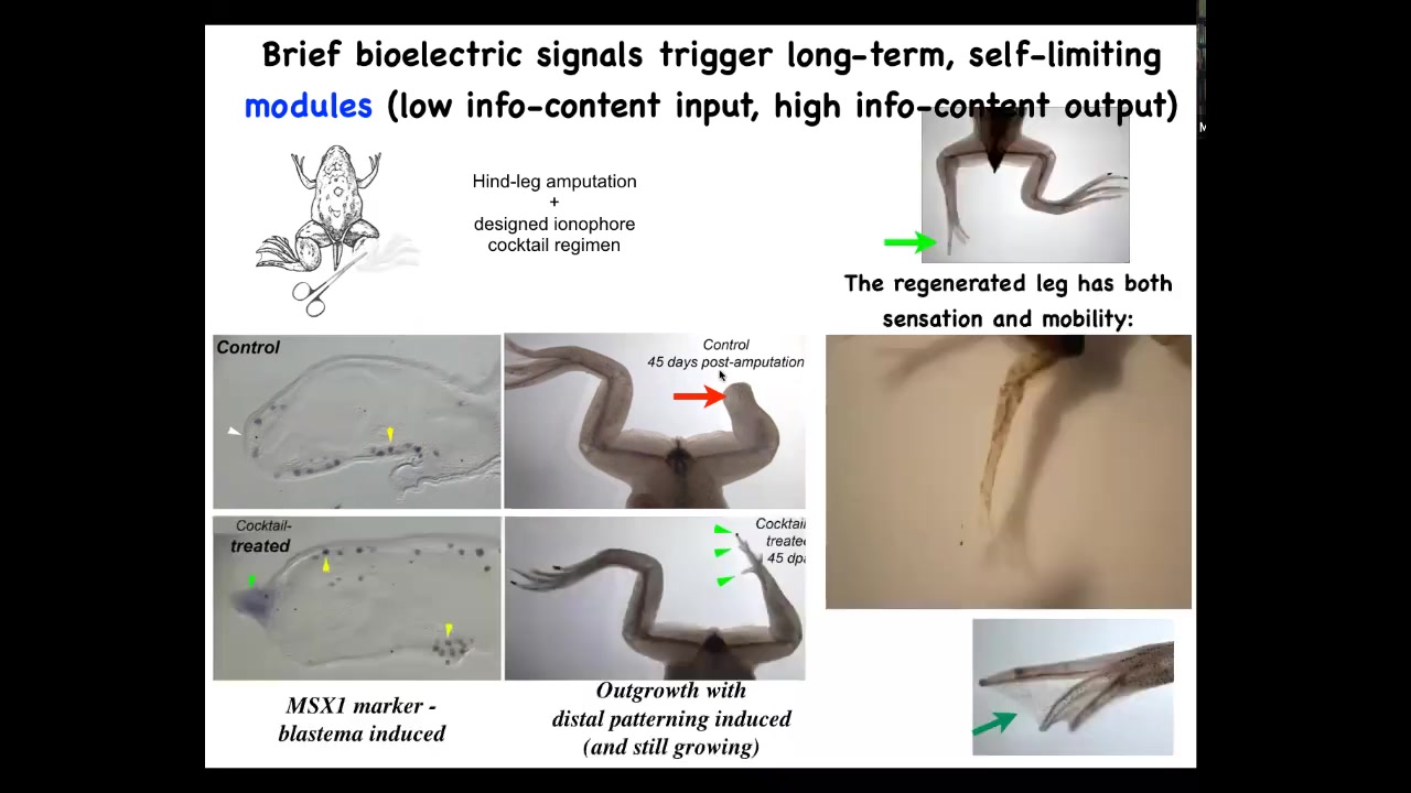 But what we've done is we've created a bioelectrical cocktail that, when you apply to the early wound, shifts the decision-making of that collective towards a leg-regenerating goal. It's just a single-day treatment, and then you get about a year of leg growth. By 45 days, this MSX1 blastema marker, the blastema genes are turned on. By 45 days, you've got a toenail, you've got some toes, and eventually a quite respectable leg. The leg is touch sensitive and it's motile. So the animal can use this leg. Again, it's this idea of communicating a very simple thing to a collective and then taking your hands off the wheel, not trying to micromanage what the stem cells do or what the gene expression is. All of that is handled top down. The idea is to give the appropriate information at the very beginning.