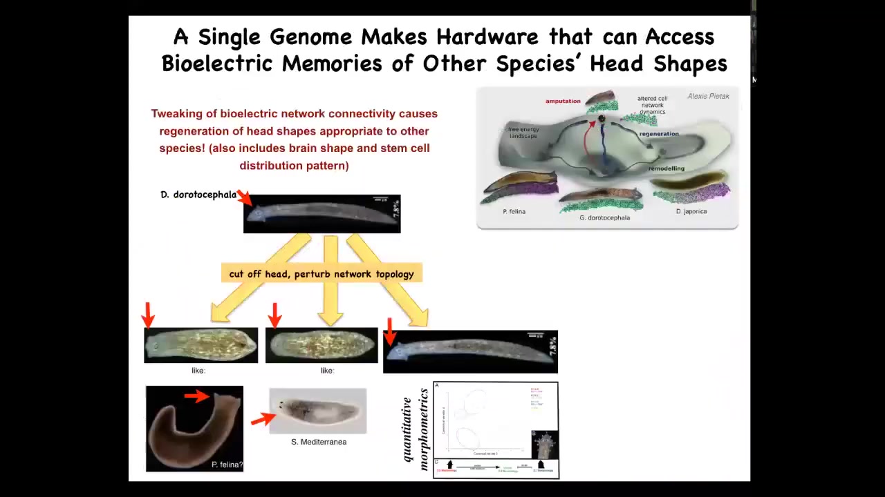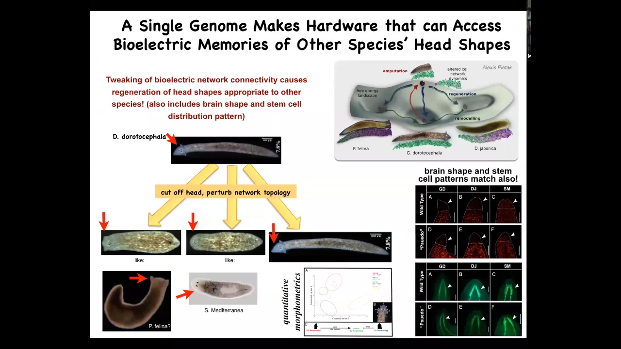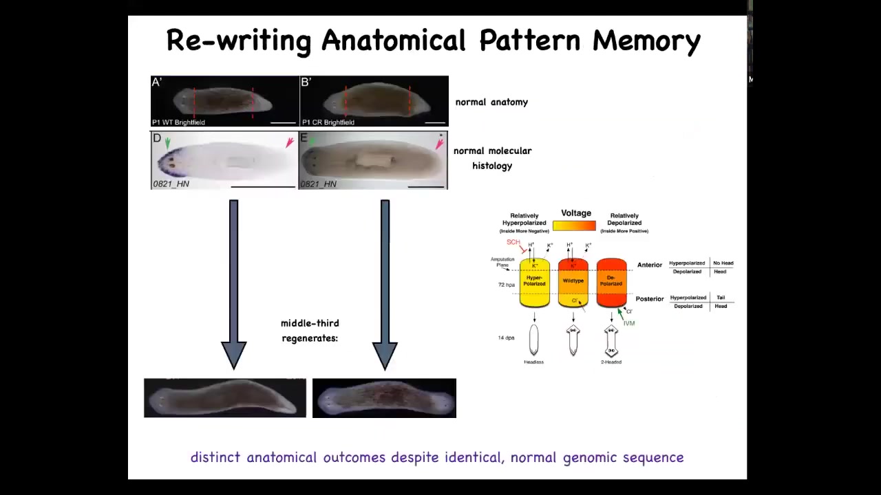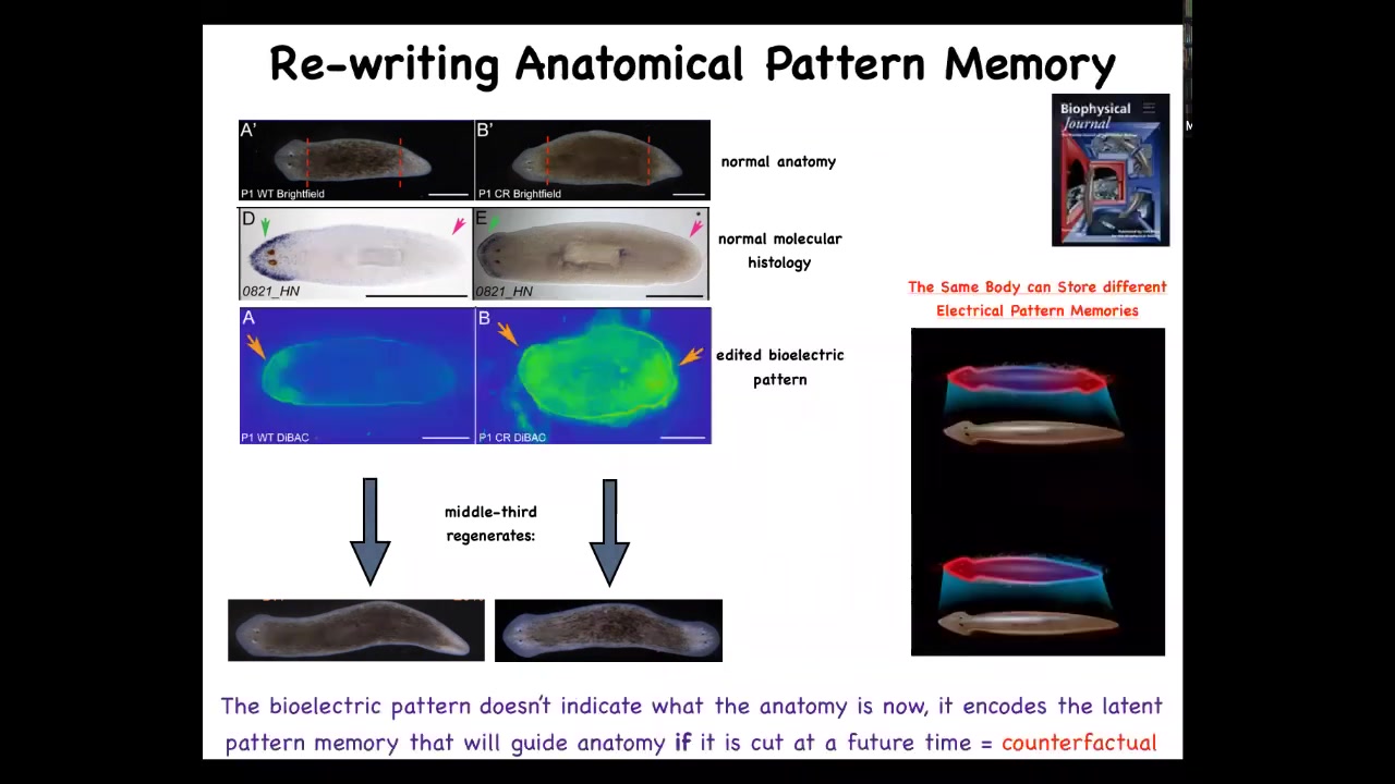 This is, if you're interested in neuroscience and our brain's amazing ability for what they call time travel, the ability to store and imagine states that are not true right now. So either things that were true or things that might be true later, but are not true right now. I think this is a good example of a very basic, primitive version of this because this tissue can store a bioelectrical pattern of what it will do if it gets injured in the future. It's a counterfactual memory. It's not true right now. And so a single planarian body can store up to two different ideas of what a correct planarian should look like.