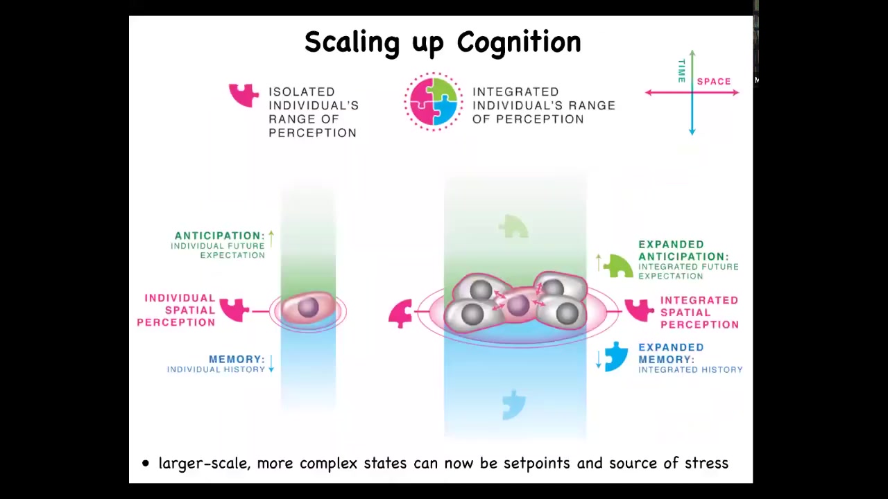 I think that what happens is that when you have single cells, they have memory going backwards. This has been shown in the field of basal cognition: cells have the ability to anticipate future stimuli, but it's quite small. Both in space and time, it's quite small. When you join together into larger networks, you have more computational ability to store past memories. You have more ability to predict future states, and you have a larger spatial perception; you're able to collectively measure things on a physically larger scale. If this is how collectives form, we ought to be able to use this to address the cancer problem.