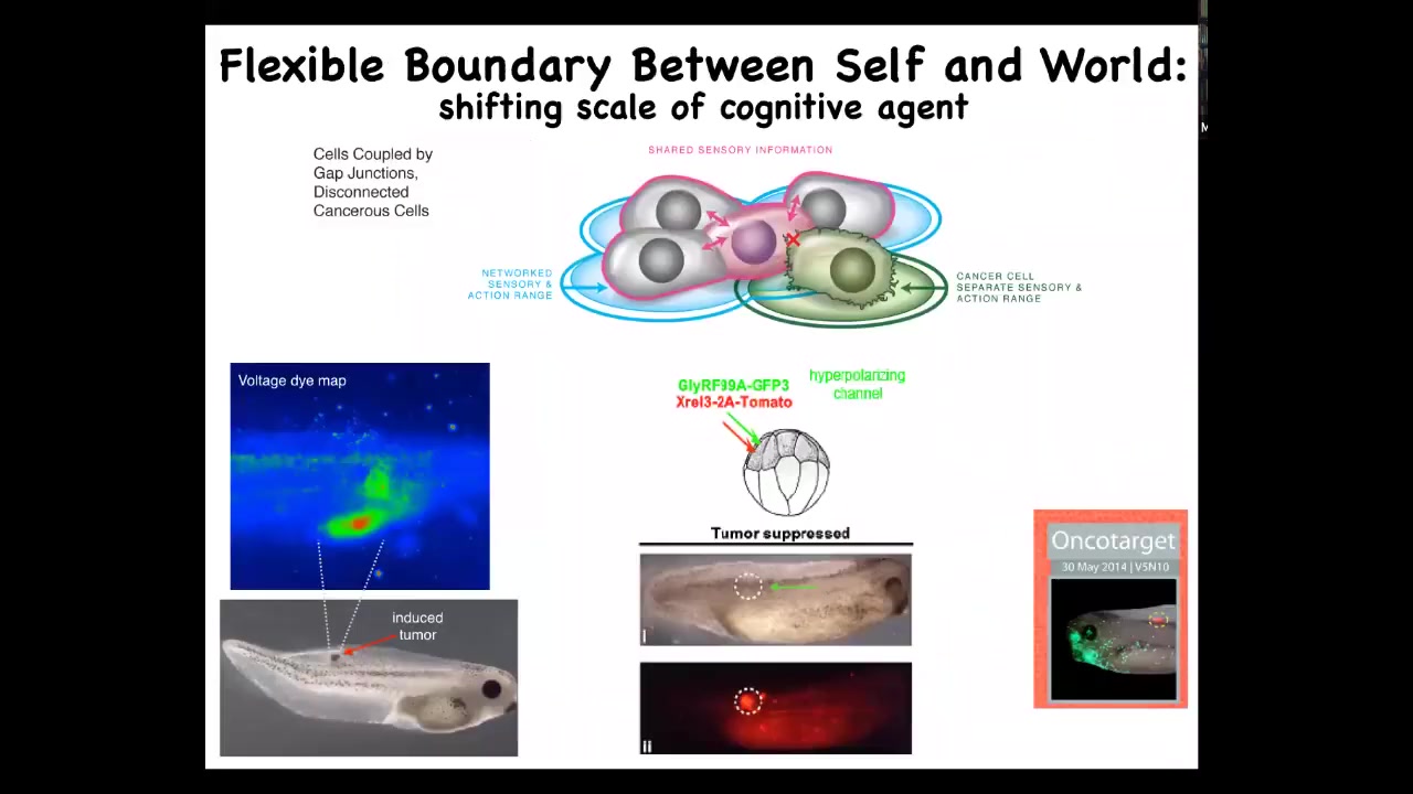 When you do that, the oncoprotein is labeled with red fluorescence. It's very bright. It's all over the place. You can see this is the same animal. There's no tumor. What we've done is co-inject a particular ion channel that sets an electrical state that forces these cells into the normal communication with their neighbors, and they participate in normal morphogenesis. They make skin; they make the various organs, instead of going off on their own and making a tumor.