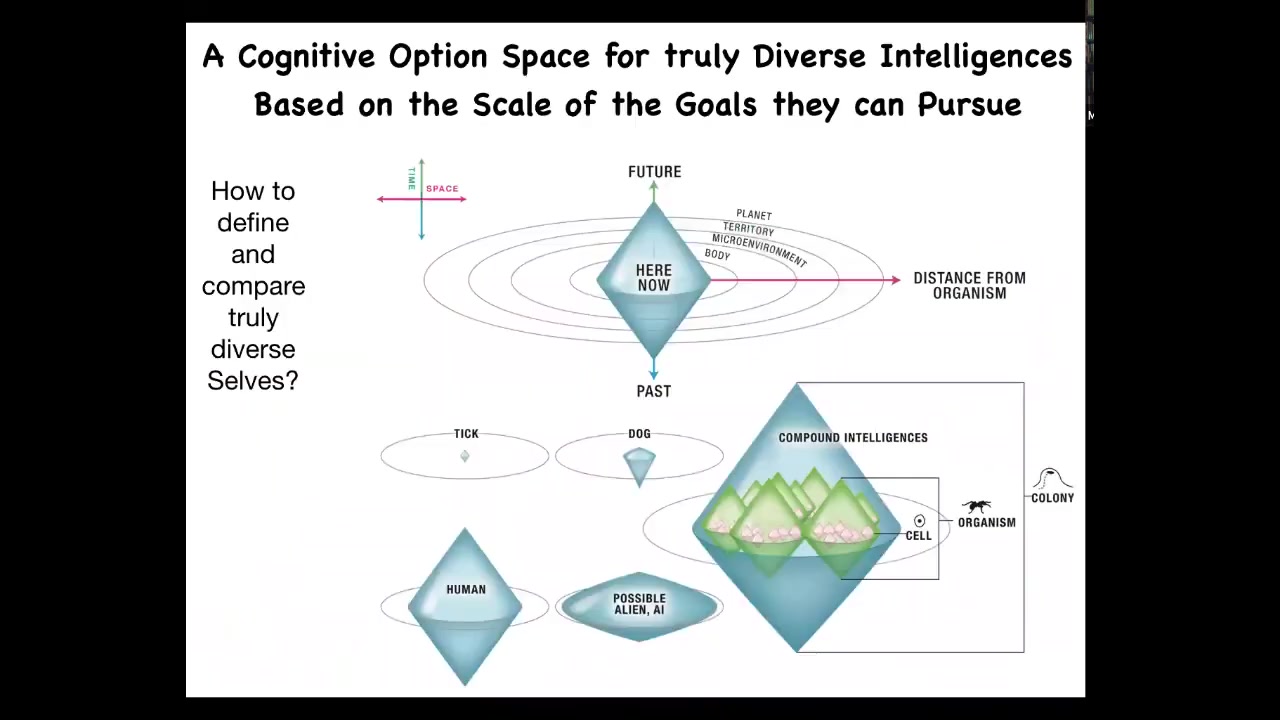 I think there's no privileged substrate for cognition. I think that there's nothing magical about biological substrates. We're going to have intelligences that are extremely diverse. We have this notion of the self, described by a cognitive light cone as the size of the goal, the largest goal that it's capable of pursuing, with this idea of evolution and engineers pivoting these systems through different problem spaces. And it doesn't have to be three-dimensional space.