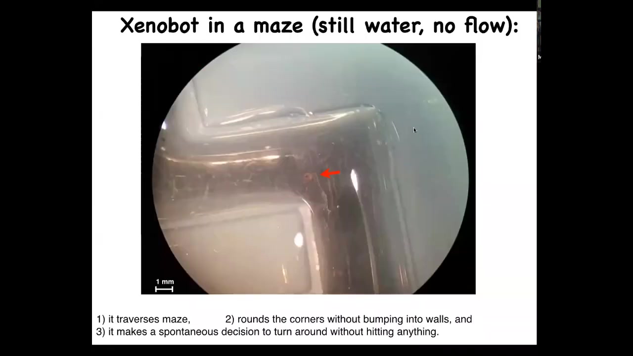 Here's one navigating a maze. What you can see here: the water is perfectly still. It will move forward. It takes a turn without bumping into the opposite wall. And then at this point, for some internal reason that we don't know, it decides to turn around and go back where it came from. This is a very simple example of spontaneous self-determined motion. There's some kind of process inside that guides what it does. It can take turns. It can change direction and go back.