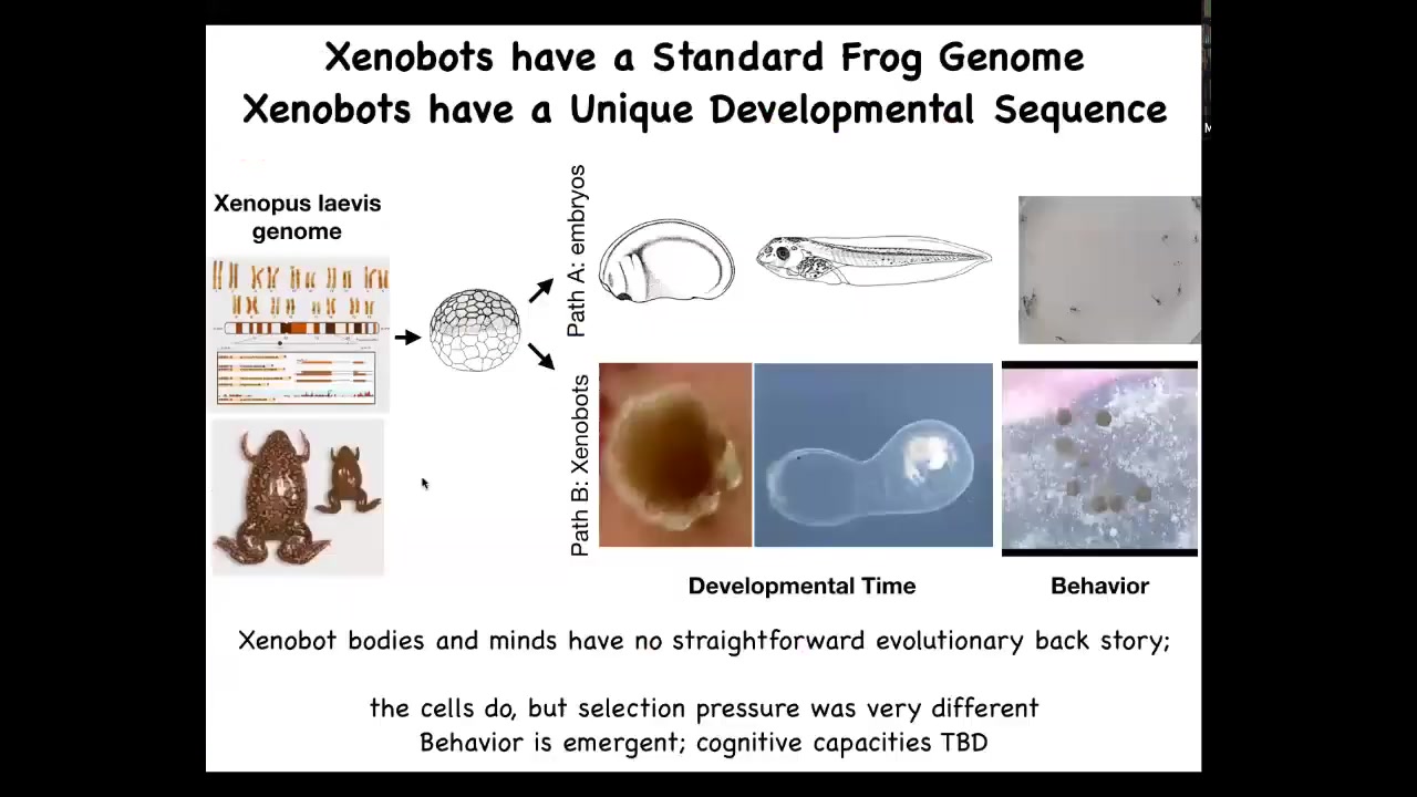 The other thing about this is that for any other living organism, if you ask why it has a certain shape, a certain size, certain behaviors, the answer usually is evolution — the anatomical goals come from evolution. You've been selected for eons to be a specific kind of shape. There have never been any xenobots. There has never been any evolutionary pressure to be a good xenobot. All of this is completely emergent from the generic problem-solving capacity of these cells.