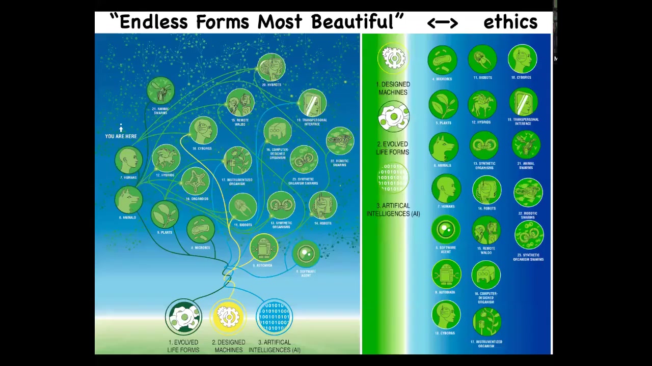 When Darwin said the phrase "endless forms most beautiful," when he was interested and impressed by the wide variety of shapes out there in the biological world, all of that is a tiny corner of possible space of agents. Because biology is highly interoperable, it solves problems that it's never seen, which means that any combination of evolved material, designed material, and software is a viable agent. We have hybrids and cyborgs and all kinds of different things; many of these are already being made.