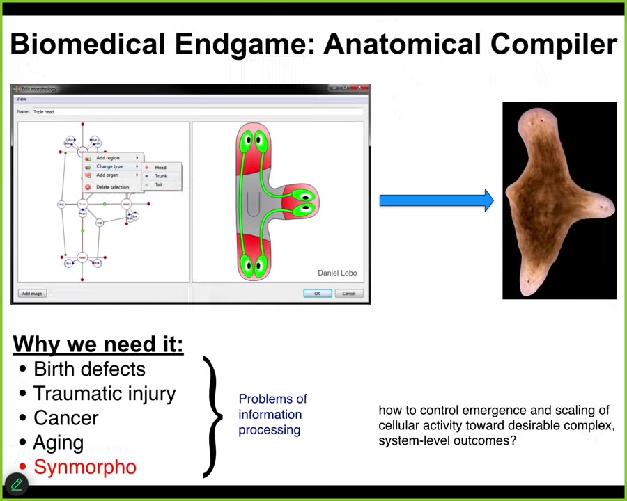 One of the great challenges in our field, which is both synthetic morphology and biomedicine, is that someday you want to sit in front of a computer and you want to draw the plant, animal, biobot, organ, whatever you want with no limitations. What this thing should do is compile that description down to a set of stimuli that would be given to cells to get them to build whatever you want, such as this three-headed flatworm.