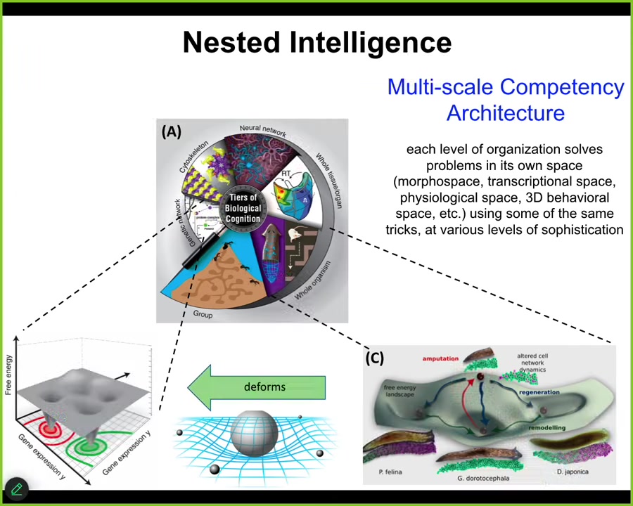 What I think is happening here is a multi-scale competency architecture where each level is basically deforming the option space for the levels below. Each level is navigating that space, context-sensitive navigation of the option space, and these are transcriptional spaces, physiological state spaces, anatomical morphospace.