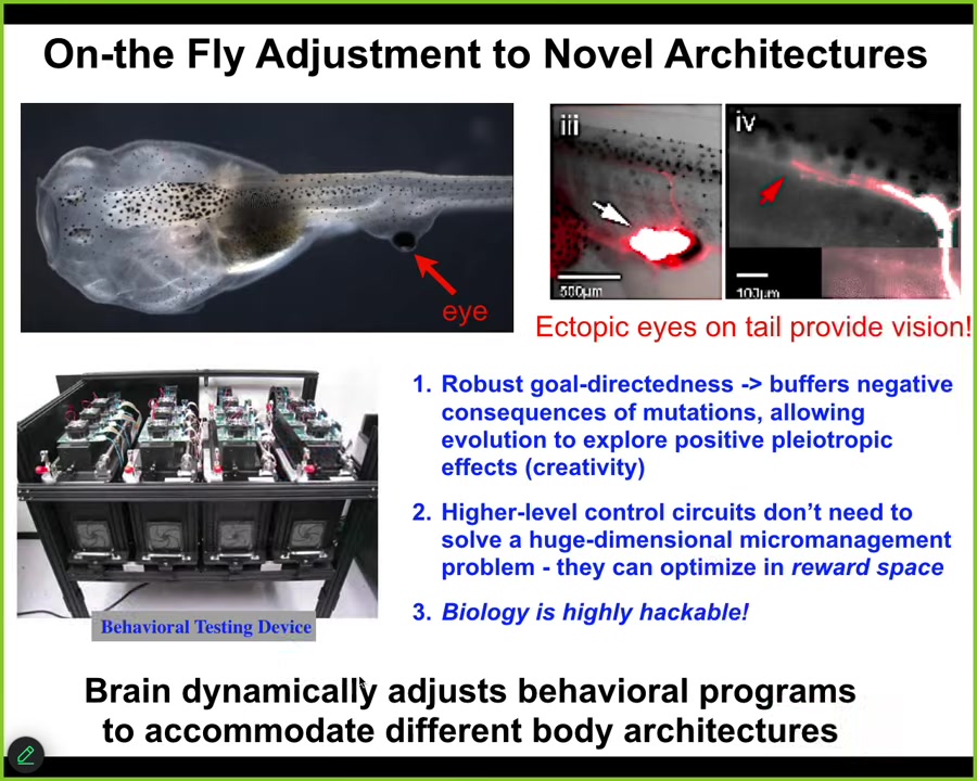 First, as an example, there are many cool versions of this. Here's a tadpole of the frog. You'll see nostrils, mouth, brain here, gut. We've prevented the primary eyes from forming, but we've put an eye on its tail. By building a machine that automates the training and testing of these guys in visual cues, we notice they can see perfectly well. Here's the ectopic eye. It makes one optic nerve. Sometimes it goes to the spinal cord, sometimes to the gut, never to the brain. Yet they can see and learn in visual tasks. That's amazing. Why does this animal with a novel sensory-motor architecture not require new rounds of mutation, selection, adaptation? It works out-of-the-box. The plasticity for these kinds of things is absolutely enormous. We can really take advantage of this in bioengineering. It's not just animals.