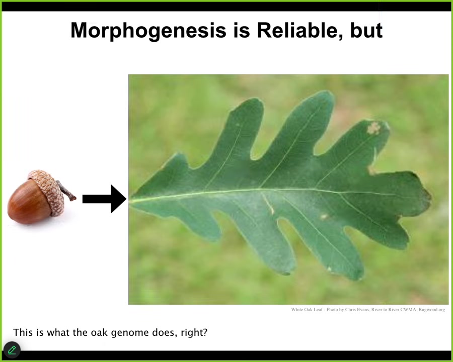 Plants do this too. Development is an incredibly reliable process. You might think that what the oak genome encodes is the ability to build this flat green thing. It does it all the time, very consistently.