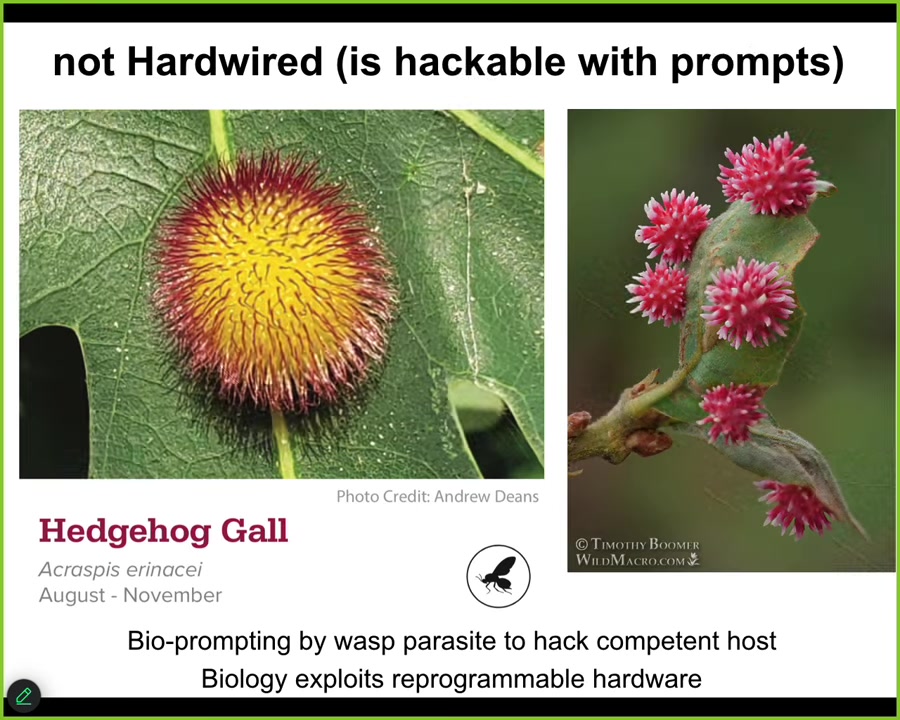 Except that along comes a non-human bioengineer, this wasp. And it puts down some prompts that cause these cells to build something completely different.