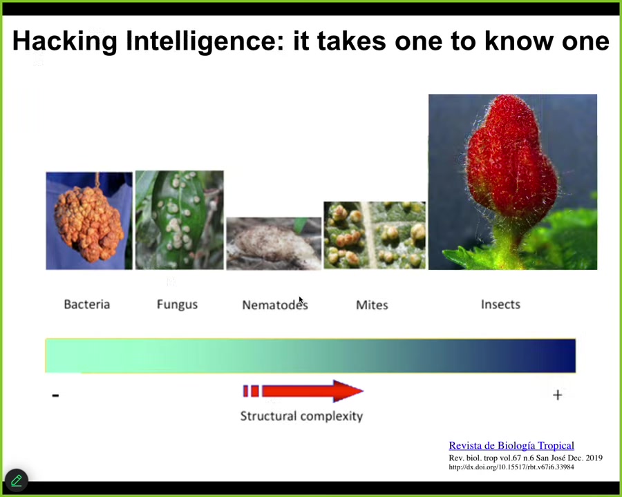 In order to find out what they're capable of building, we are going to have to ratchet up our own intelligence. You can see there's a cool relationship between the sophistication of the hacker and the complexity of what it actually builds. Bacteria induce galls that are featureless lumps, fungi do the same. Nematodes and mites make something that has a shape, but by the time you get to insects, you get this beautiful structure. There's a bi-directional relationship between how smart we are as hackers and what we can get the material to do.
