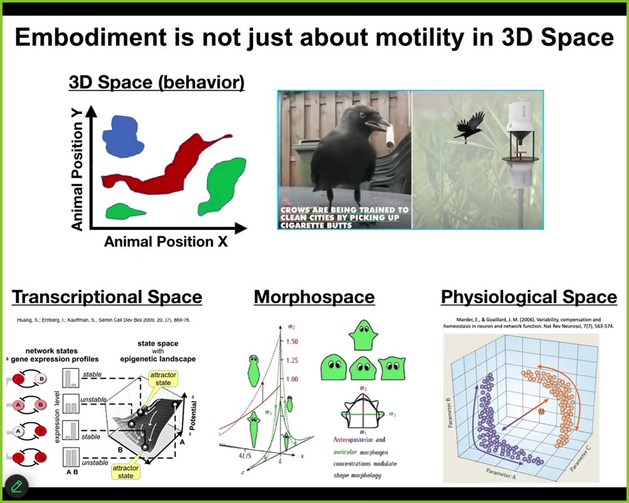 As I pointed out, we as humans, because of our own evolutionary history, are obsessed with three-dimensional space. We are okay at recognizing intelligence of medium-sized objects moving at medium speeds through the three-dimensional space that we're used to. But biology has been navigating all these other spaces, and doing the sensing, decision-making, actuation loop in all kinds of other spaces, high-dimensional weird spaces that are hard for us to visualize, transcriptional space, anatomical morph space, which is what we study, physiological state space.
