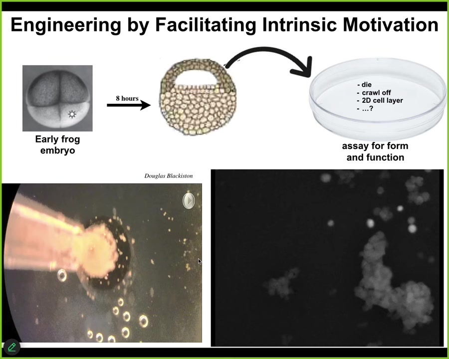 And so the very last thing that I'll say, and this is the weirdest part of this, is that we have to start thinking, if it wasn't a history of selection, which people take to explain this path, what are these Xenobots turning into? If it wasn't direct engineering, which we didn't do, all we did was liberate the cells, we didn't program them in any way, and if it wasn't selection, where does other information come from?