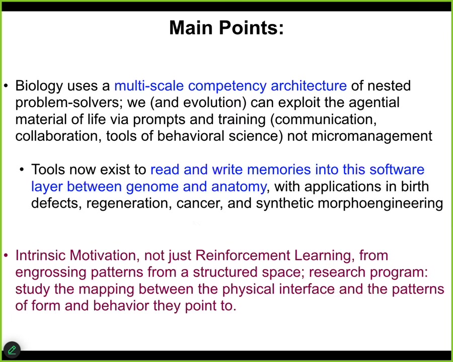 What I've tried to say is that in biology, there's this multi-scale competency architecture of nested problem solvers. We, as evolution, can exploit this material via prompts and training, not just rewiring or micromanagement. Tools are coming online to communicate with these systems via bioelectrics and other modalities. Lots of applications. We need to pay a lot of attention to the intrinsic motivation of the system, not just programming, not just reinforcement learning, but actually understand what it is that these things can do aside from what we've made them do.